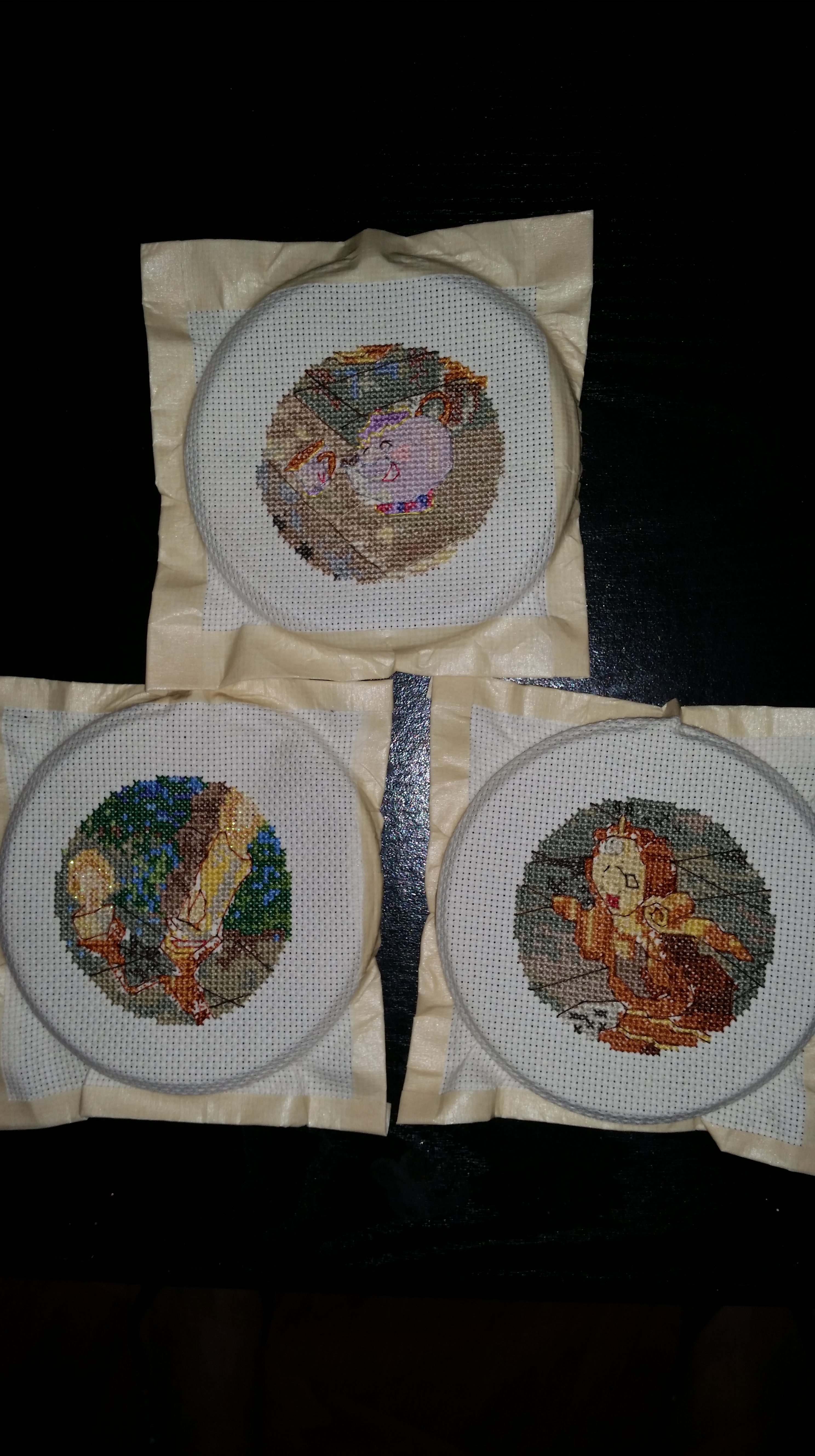 Seeing how my brother is an avid Disney fan I saw a kit on Amazon which makes 4 ornament-sized cross stitch figures of Beauty and the Beast (I believe Peter Pan is also an option) from the Thomas Kinkade selection. The picture at the top is one of 3 of the 4 I have completed thus far. Each one takes about 15-20 hours, and I will have to say they are challenging! The pattern requires mixing of colors and counting exactly where the stitch needs to be and outlining (which I will be honest, is not my favorite task, especially at the end of completing something like this). I think I did a fair job though, and I hope (cross my fingers) that my brother will enjoy them.