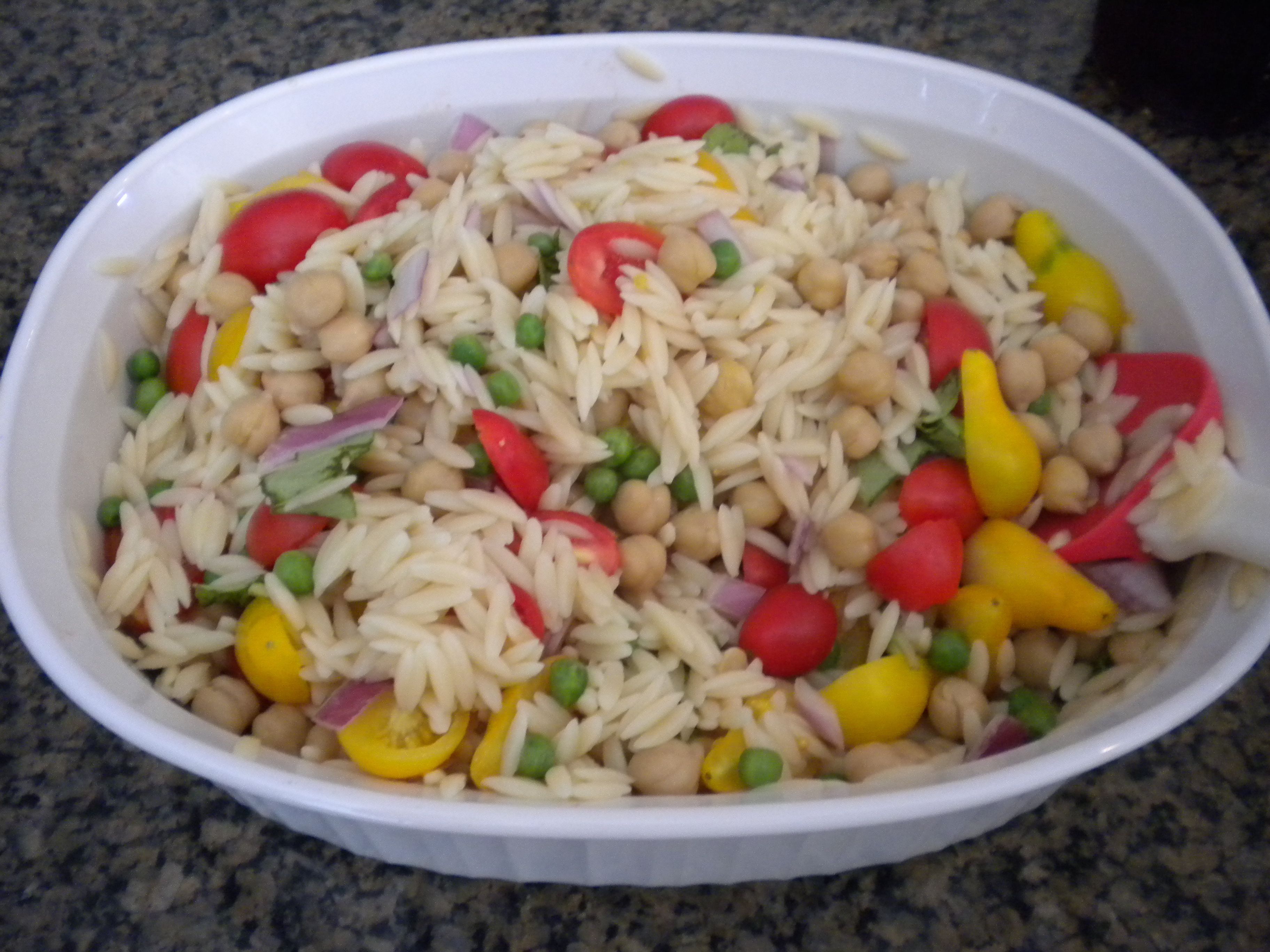 Ingredients: Orzo, chicken broth, grape tomatoes, fresh basil, can of chickpeas, lemons, salt & pepper, olive oil, red wine vinegar, chickpeas, red onion, and honey