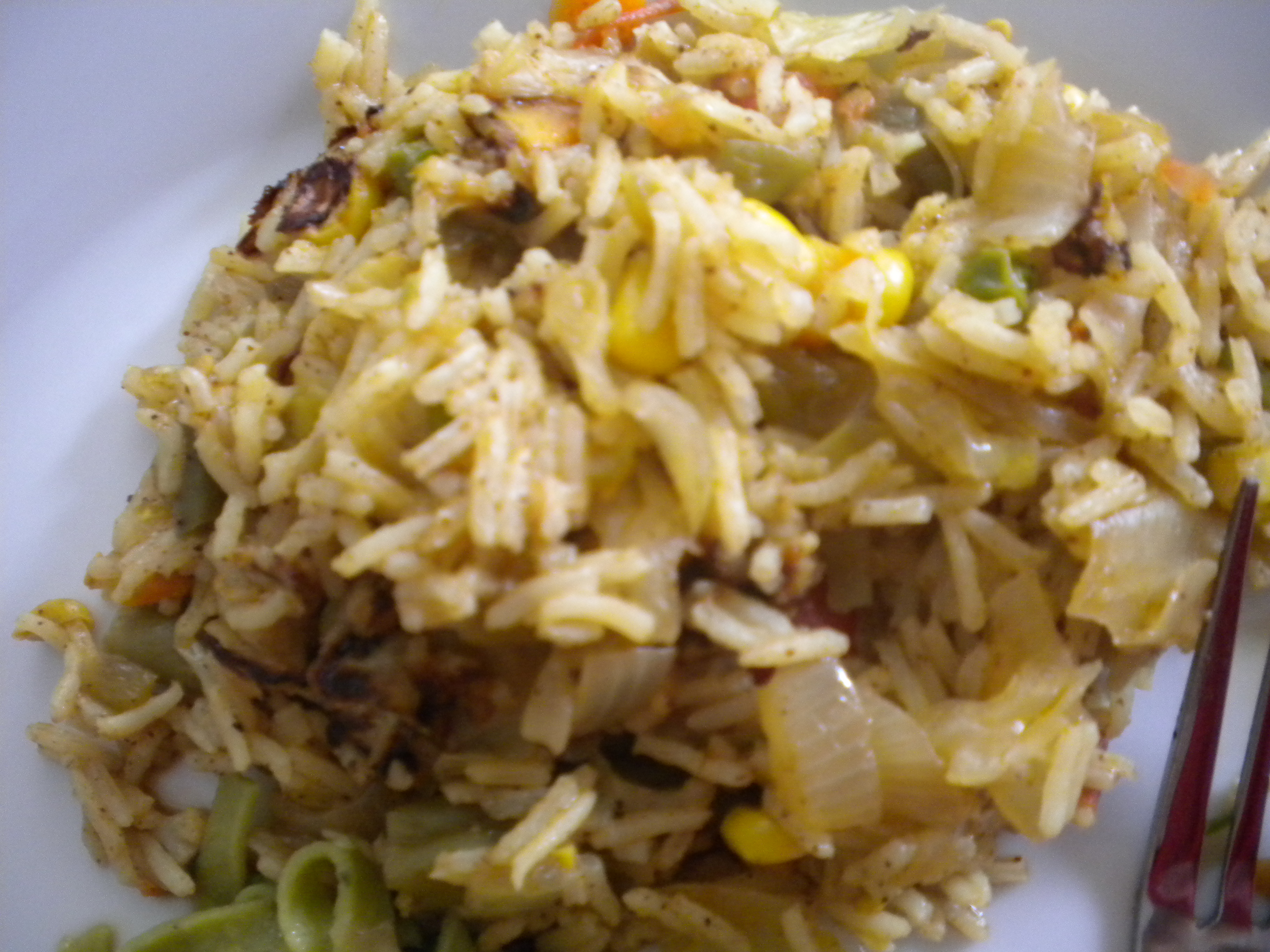 Ingredients: basmati rice (1 cup), onion, red bell pepper, green chili peppers (canned minced), green beans (canned or fresh), shredded cabbage, cauliflower (half of a frozen bag), peas and corn (half of a frozen bag), 2 tomatoes, cooking oil. Spices: Garam Masala (1 tsp), cumin (1/4 tsp), turmeric (1 tsp), chili powder (1 tsp), ginger (1/4 tsp), cinnamon (1/4 tsp, cloves (1/4 tsp), garlic salt or garlic.