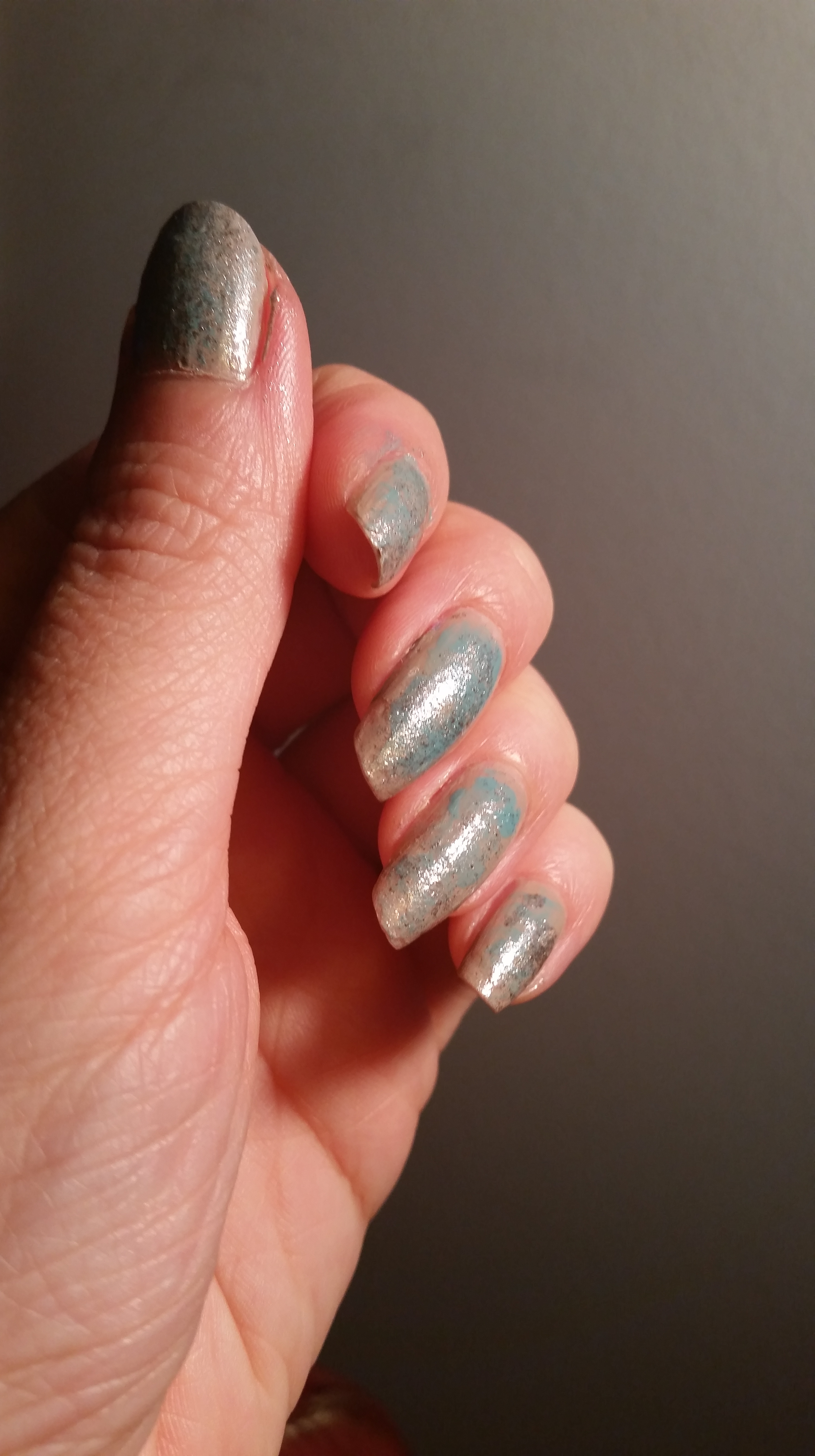 I first paint a tan and gray background onto my entire nail. Then use plastic wrap to and dabbed baby blue with a silver hue. Once that dried, I dabbed silver on top of the blue.