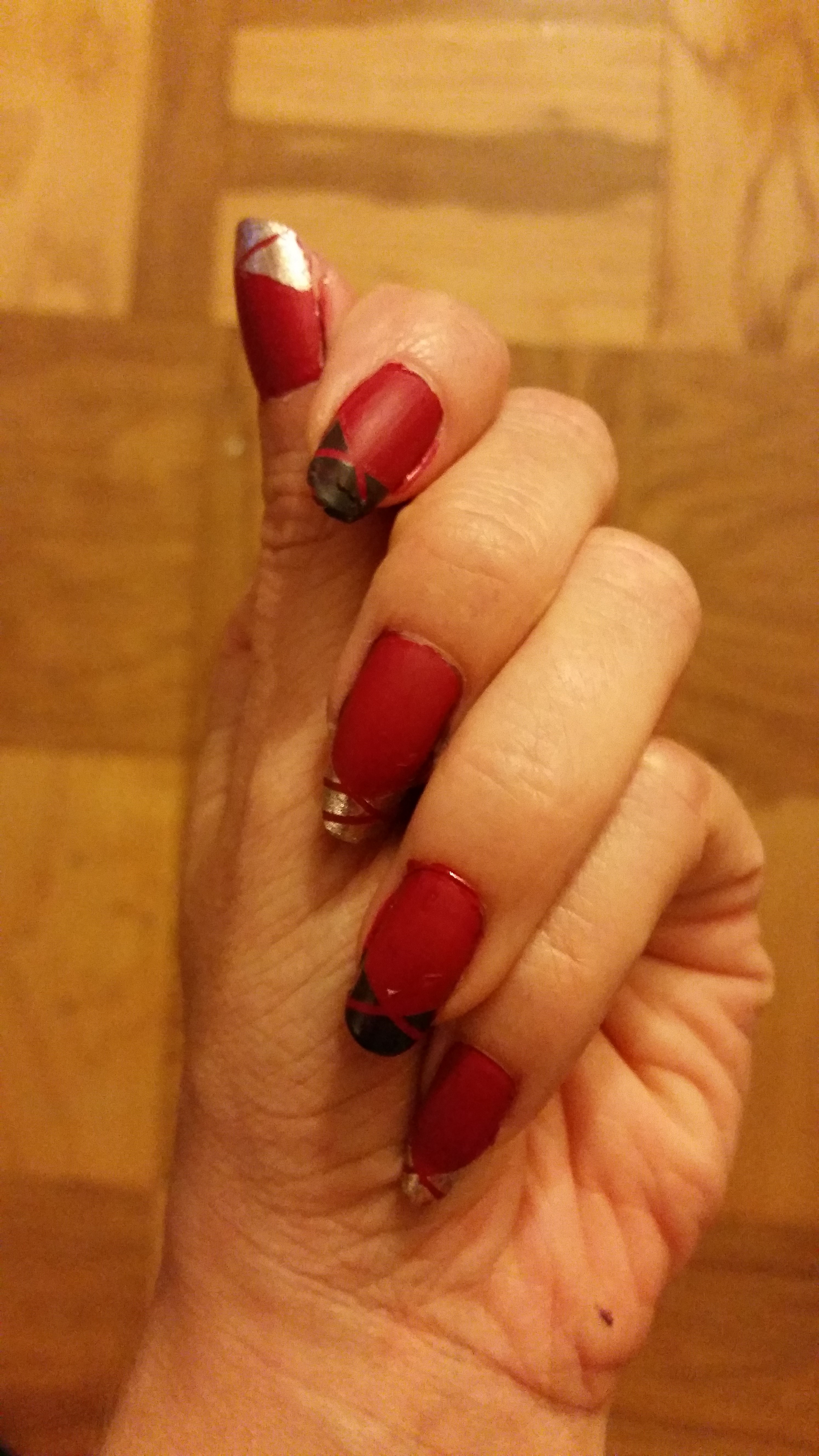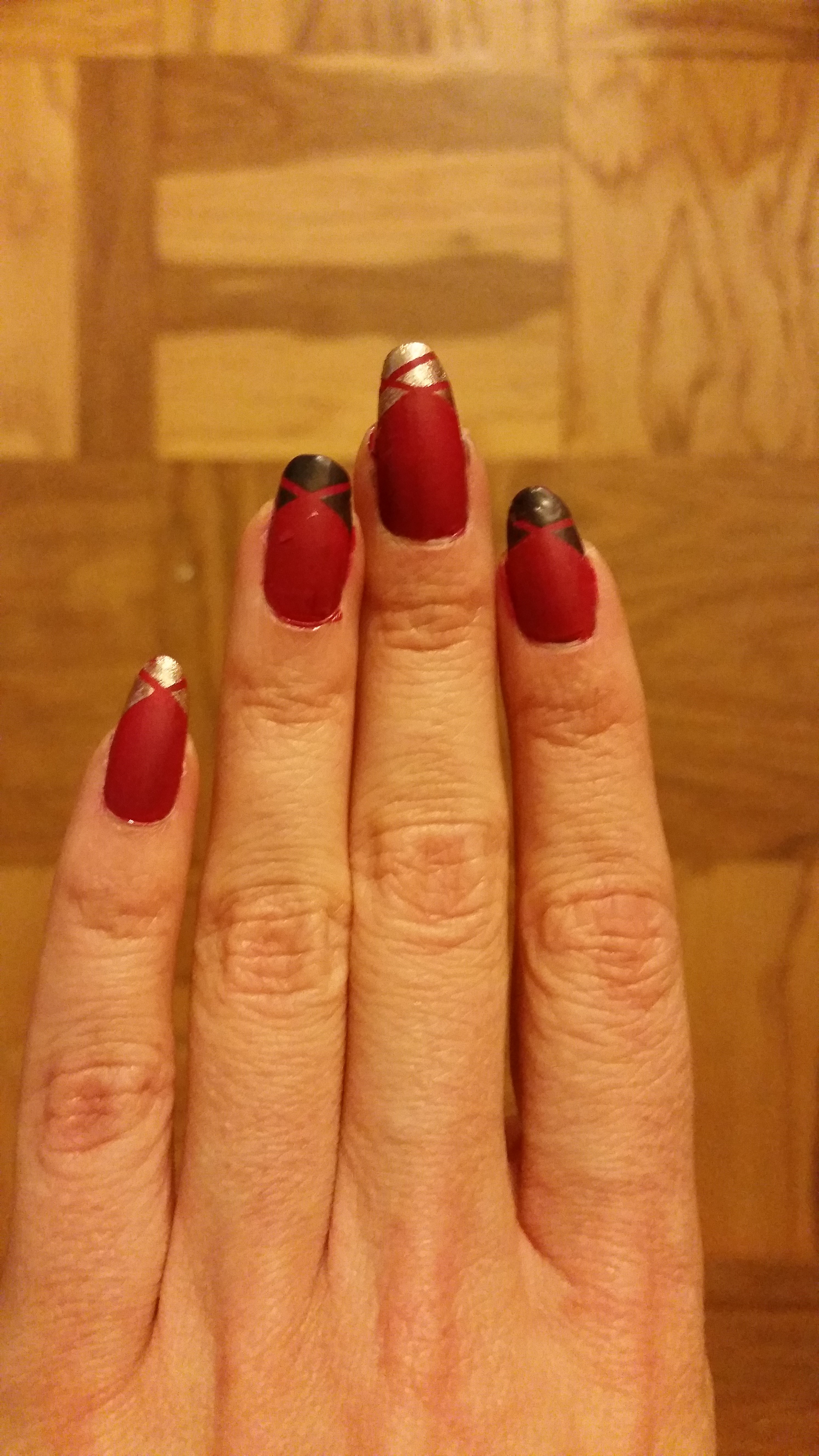 Now, I am not the hugest fan of red nail polish. It’s loud, obnoxious, and really in your face. If you are that kind of person, perfect, but I am not. I love dark colors and sometimes the occasional “loud” color. To tame this design down, I hope you notice that I the red has a matte finish. I used Sally Hansen’s “Big Matte Top Coat” to accomplish the matte finish. I did this prior to tipping my nails.