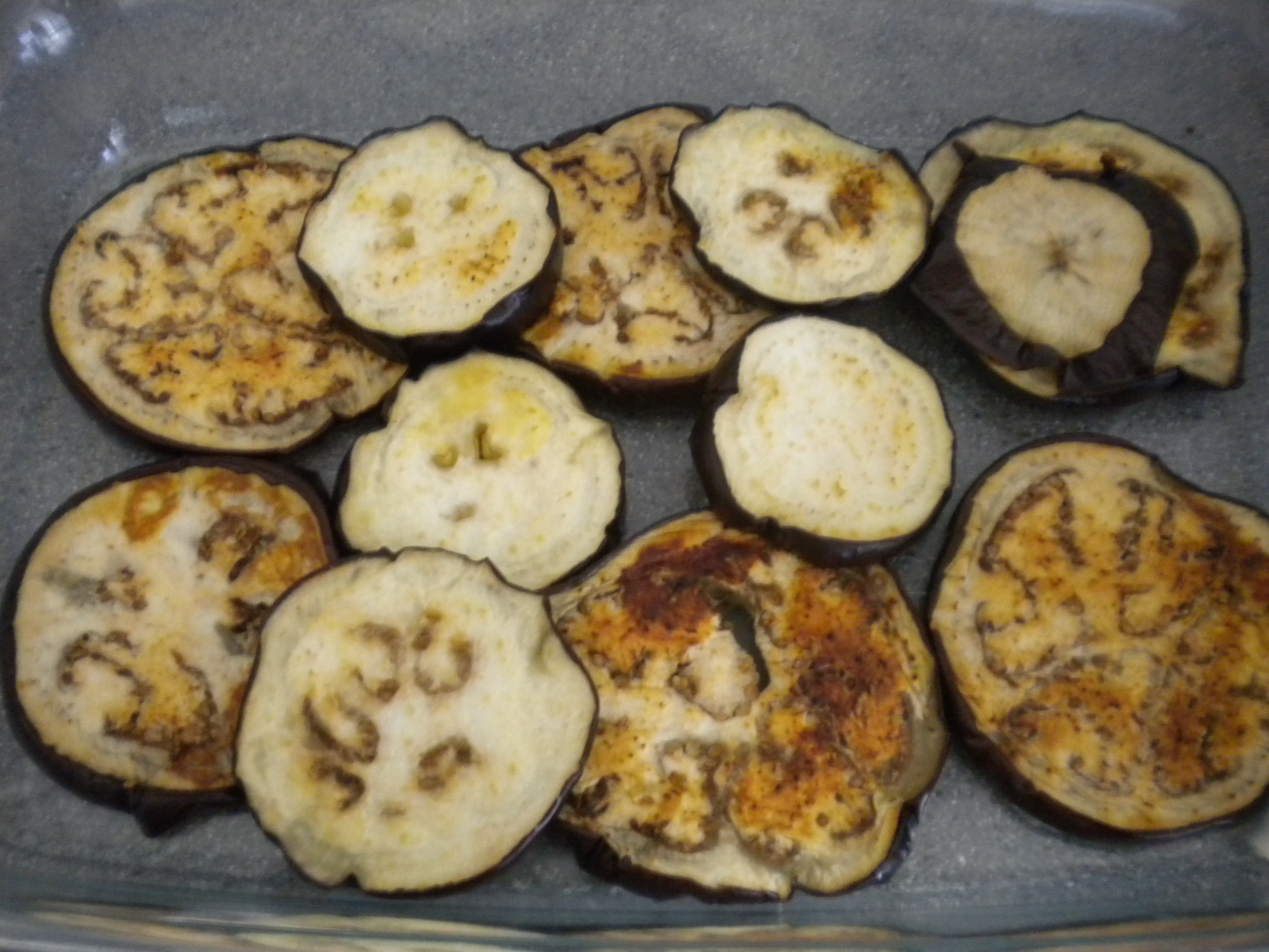 2. While onions and meat cooking, heat oven to 400. Slice an eggplant and sprinkle with salt, pepper, and a bit of olive oil.