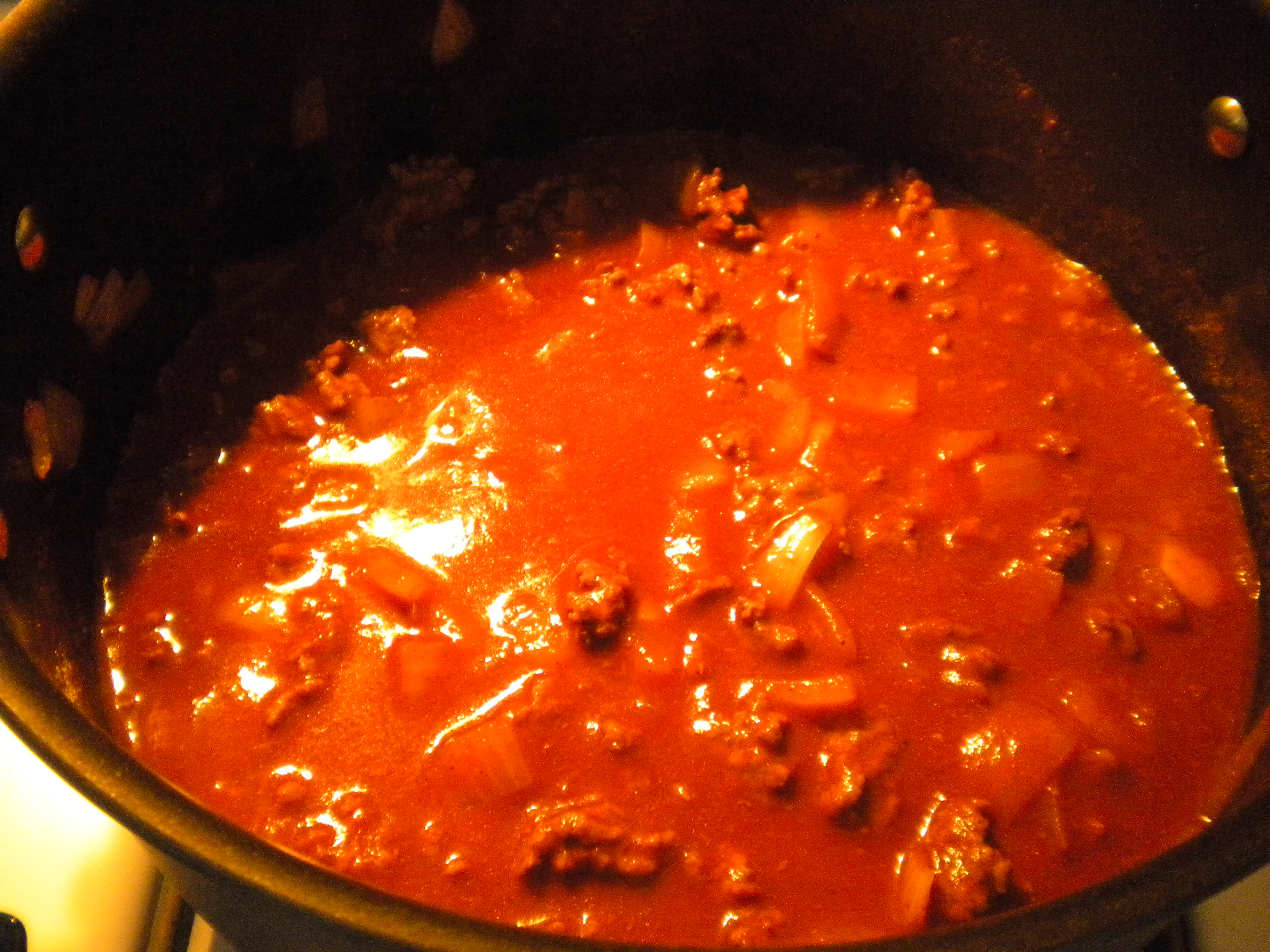 1. In a large pot, simmer onions in a tbsp of olive oil. Once cooked down, add the meat. Cook until not pink.