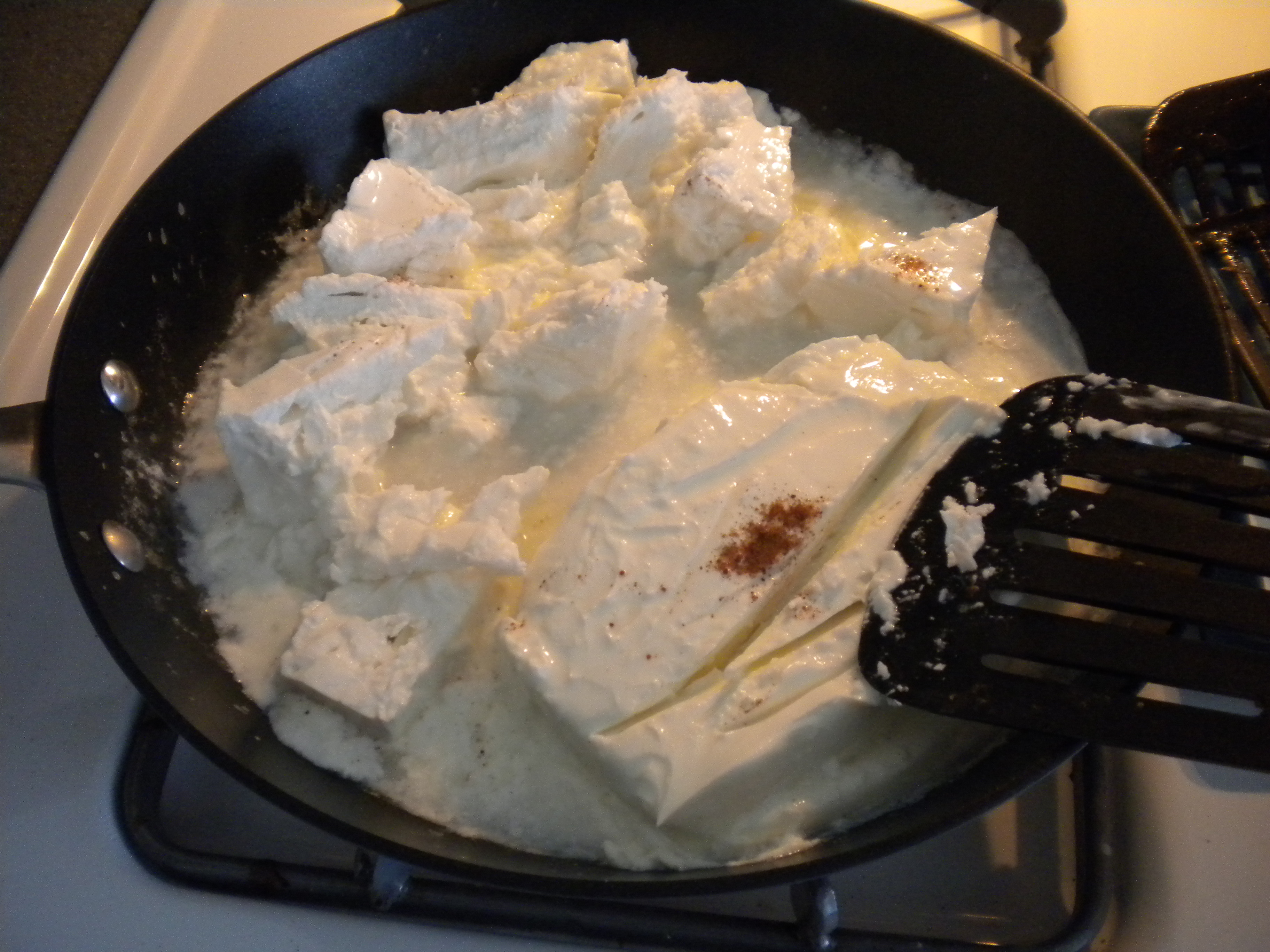 6. While the meat is finishing cooking, get another smaller sauce pan out and cook 1/4 cup of milk, cream cheese and feta cheese block until it’s all combined and smooth. I added a bit of nutmeg to this mix. YUM!