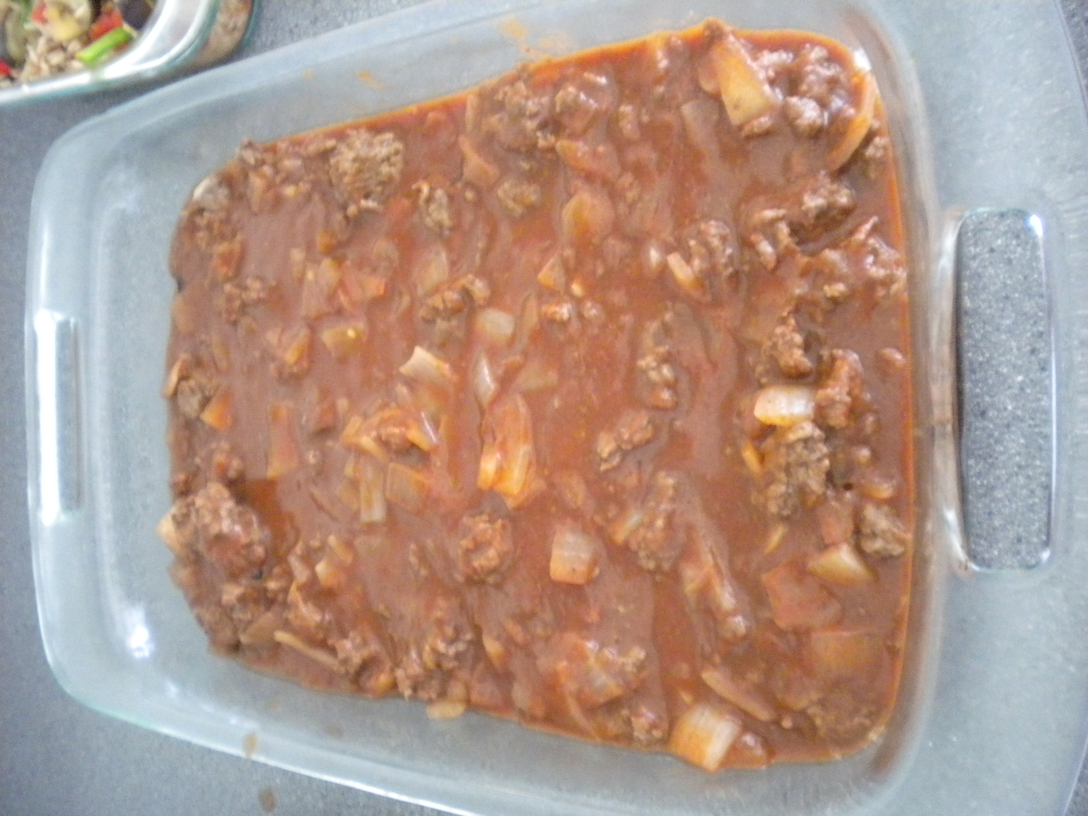 5. When eggplant is all done spray with Pam a large Pyrex dish. Line the inside of the dish with slices of eggplant. If some left over, wait until the meat mixture is done cooking then add on top of that.