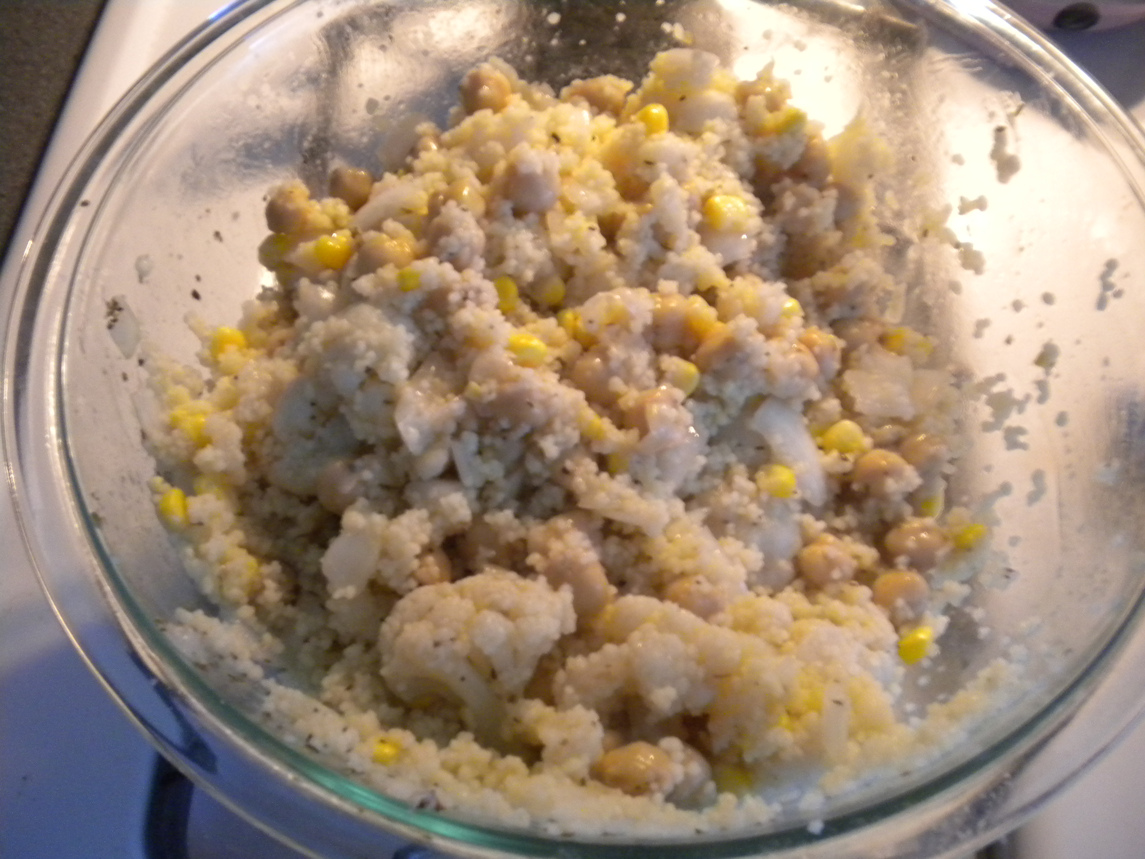 Ingredients: 1 cup quick cooking couscous, 1 can chickpeas, half of a bag frozen cauliflower, 1/2 cup of corn, 1/3 cup of chopped onions. Dressing: olive oil, cumin, lemon juice, dried basil, garlic salt, honey, ginger, balsamic vinegar