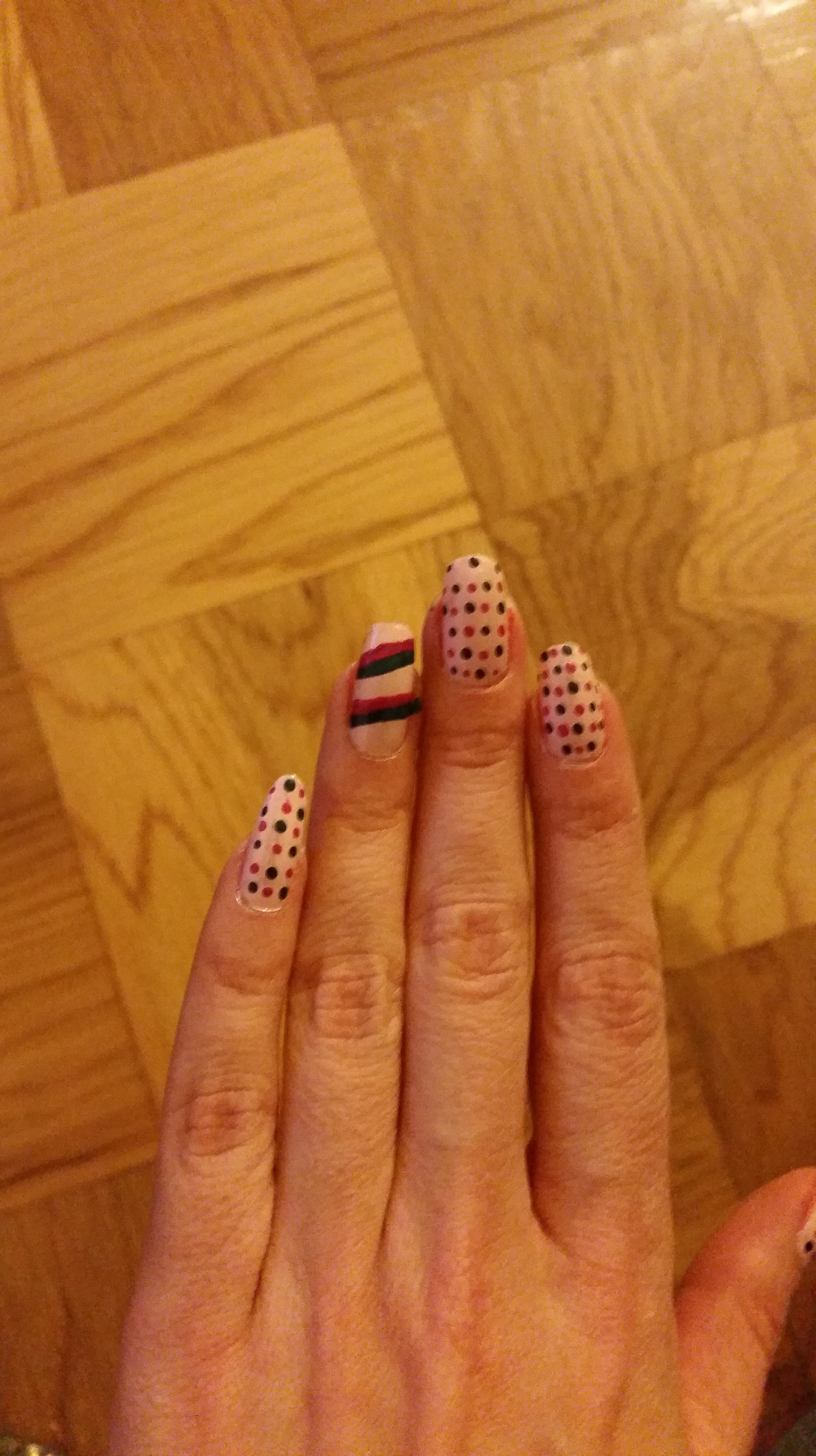 Lastly, you may know (or now I will draw your attention to) how some of the dots have feathered into the pink (even parts of the accent nail). I sealed my design with a top coat, and even though I thought it was dry the top coat caused the feathering. Dots are a challenge to work with because they leave a glob of polish that wont dry quickly, so when you add a top coat you smear the polish from the dots onto the rest of the polish. Just a note. I liked this design but wasn’t patient enough to wait for the polish to completely dry.