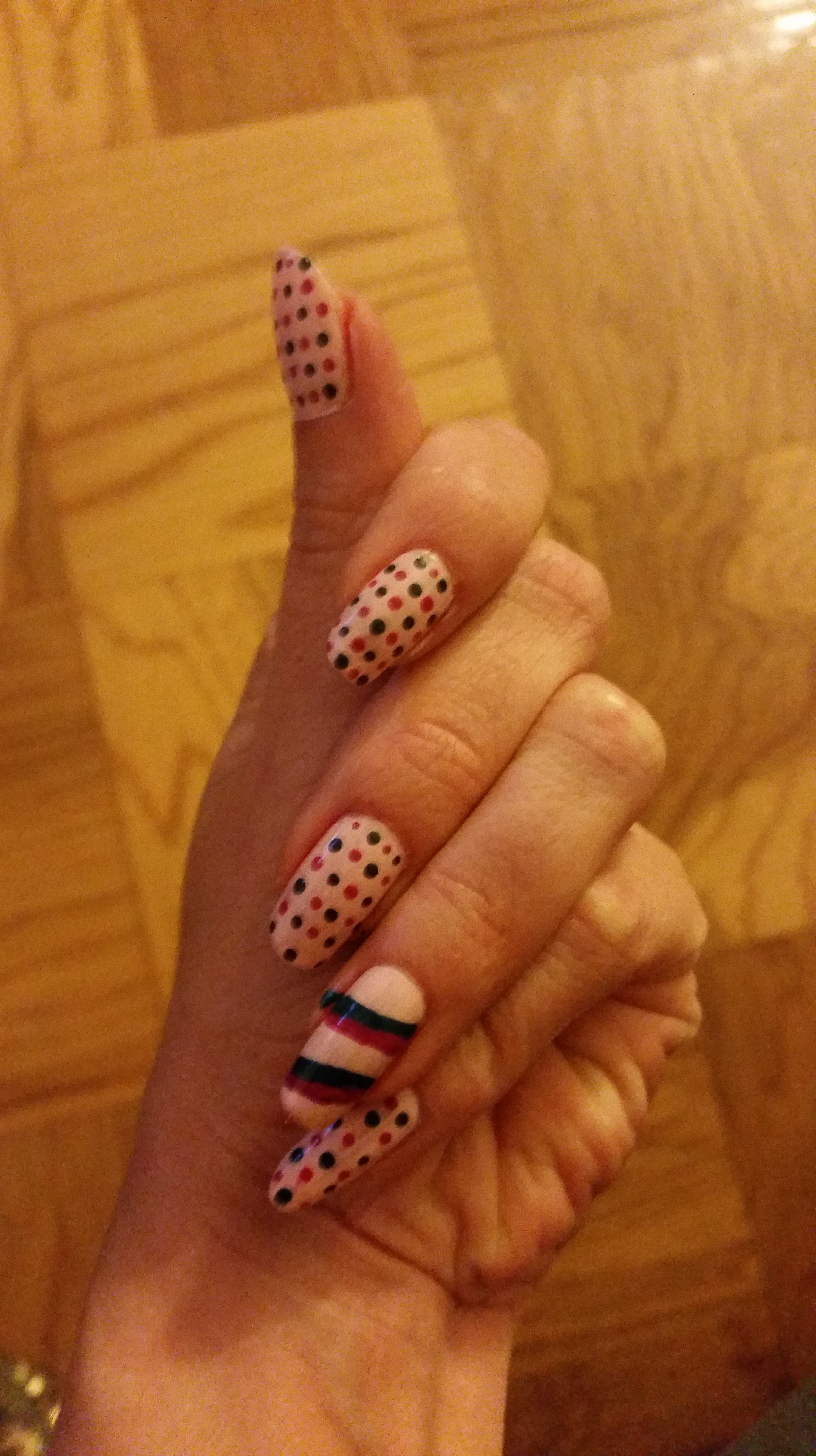 I used a light pink base (2 coats) and a dark green/teal and magenta color for the dots. Honestly, it’s easiest if you start with one color and leave room for the other colored dots so you are inverting colors on your dotting tool. Note, that all of my dots are in straight lines. For this design, I think that the randomization of the dots detracts from the rigidity of the design, so I made everything as on axis as possible.