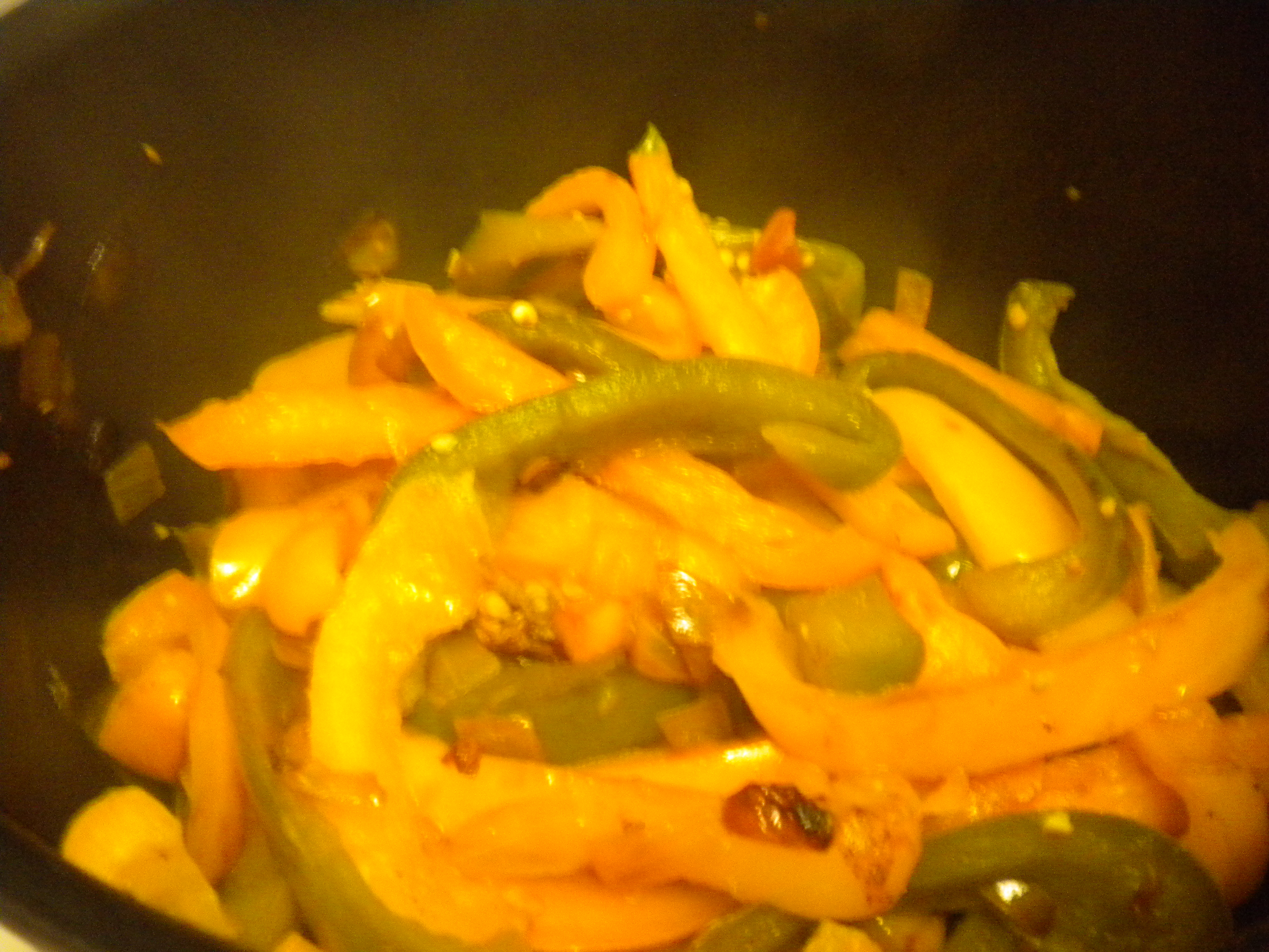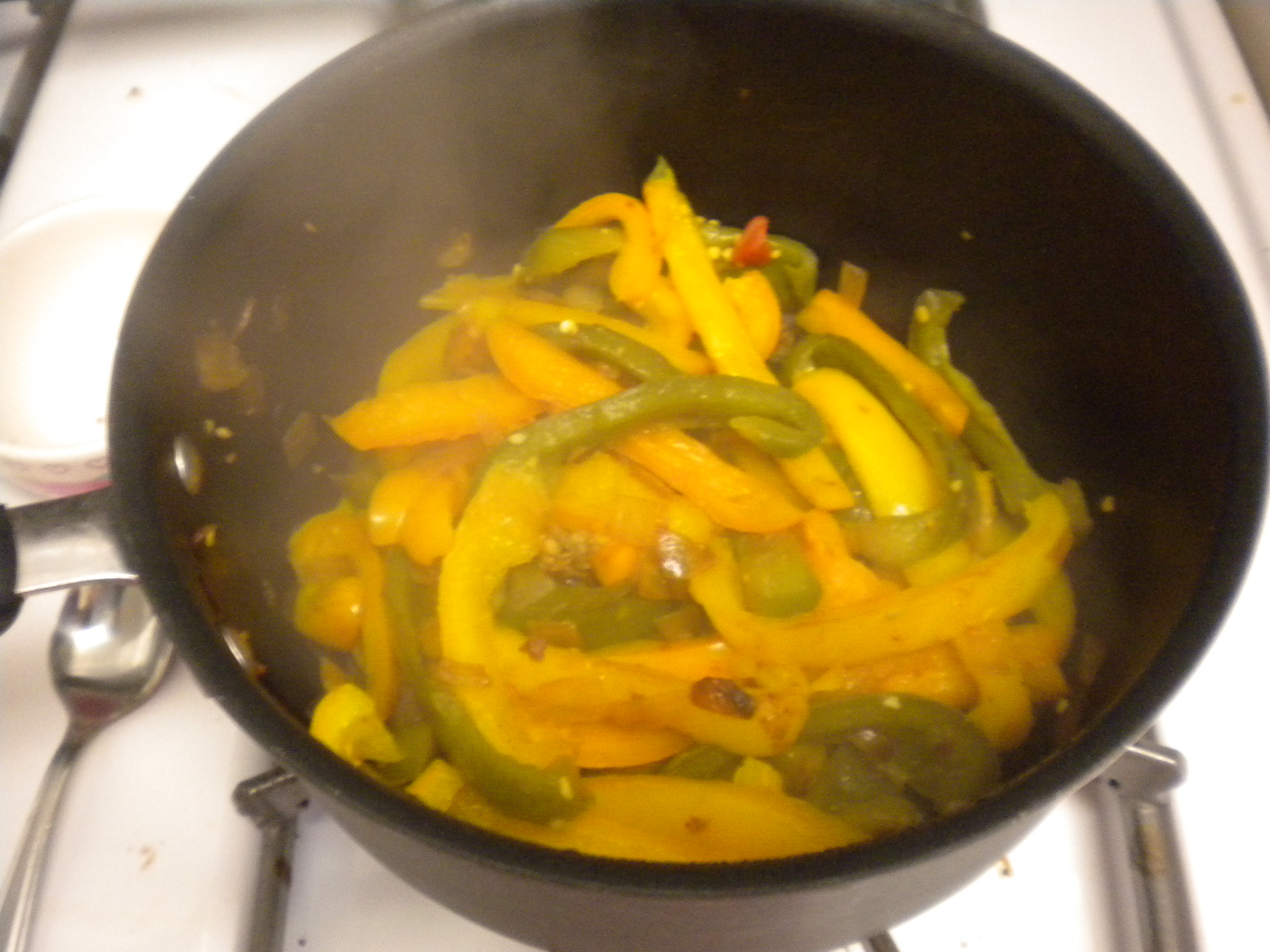 1. In a large sauce pan, place a tbsp of olive oil and saute chopped onions. Once nice and soft, add matchsticks of bell peppers until they are nice and soft.