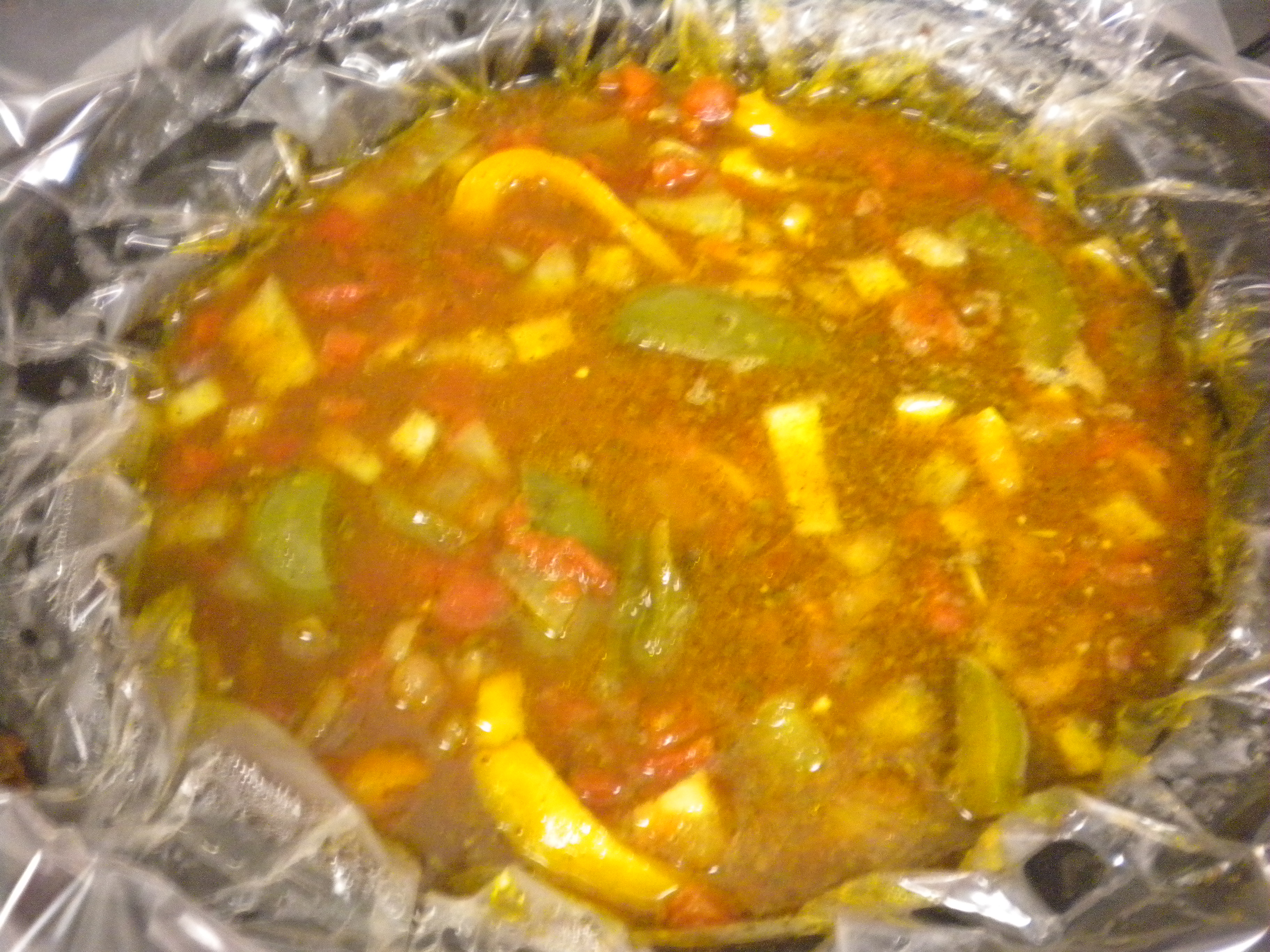 2. While peppers and onions cooking, add tomatoes, chickpeas, and all seasoning to crock pot. Stir well.