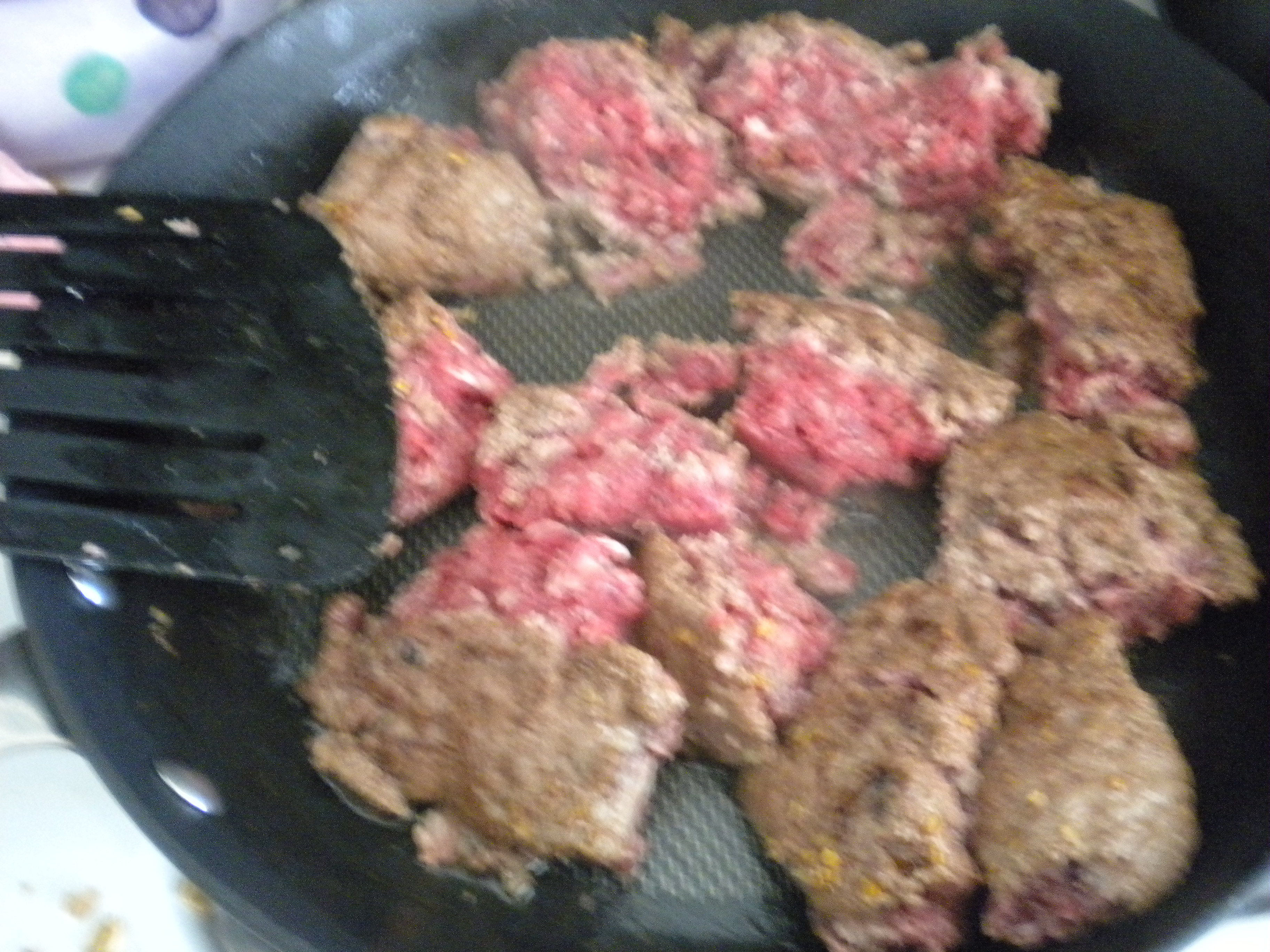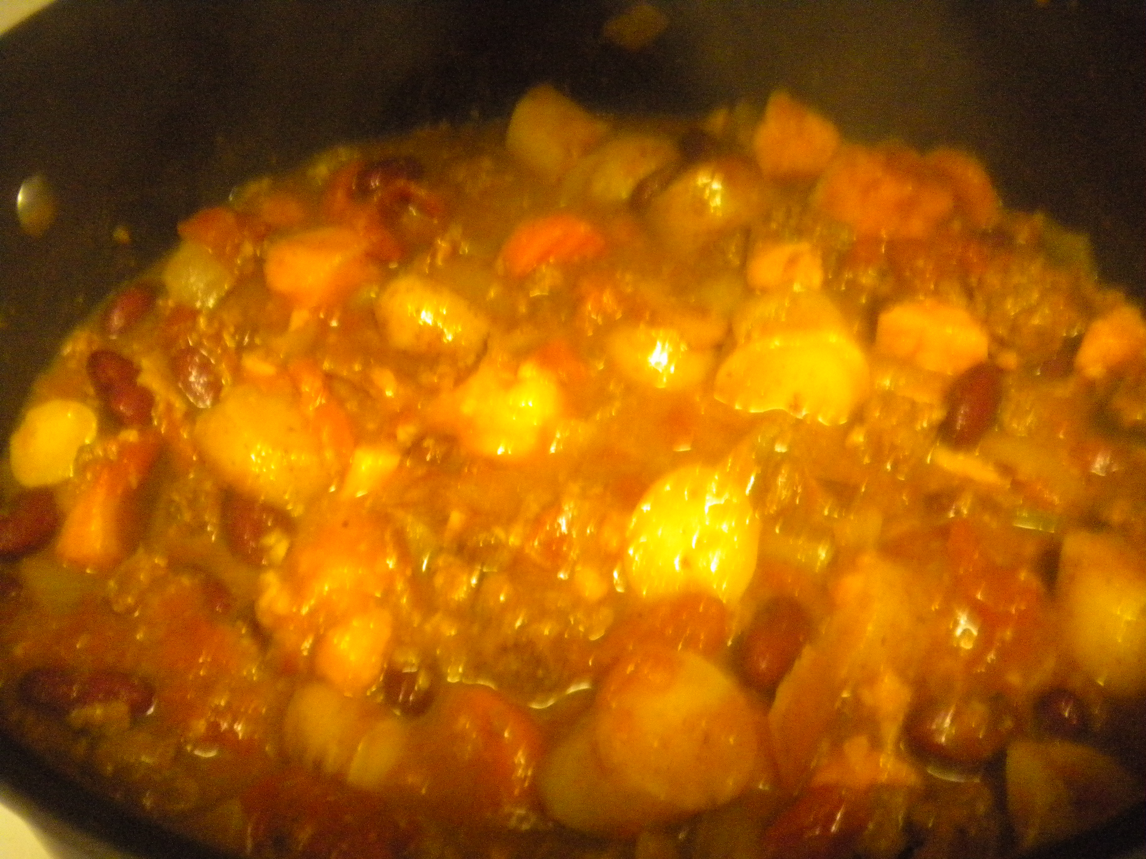 Ingredients: 1 lb bison, 1/2 onion, can diced tomatoes, can whole peeled tomatoes, can kidney beans, BBQ sauce (I used sweet and spicy), salt & pepper, carrots, sweet potato, and fingerling potatoes