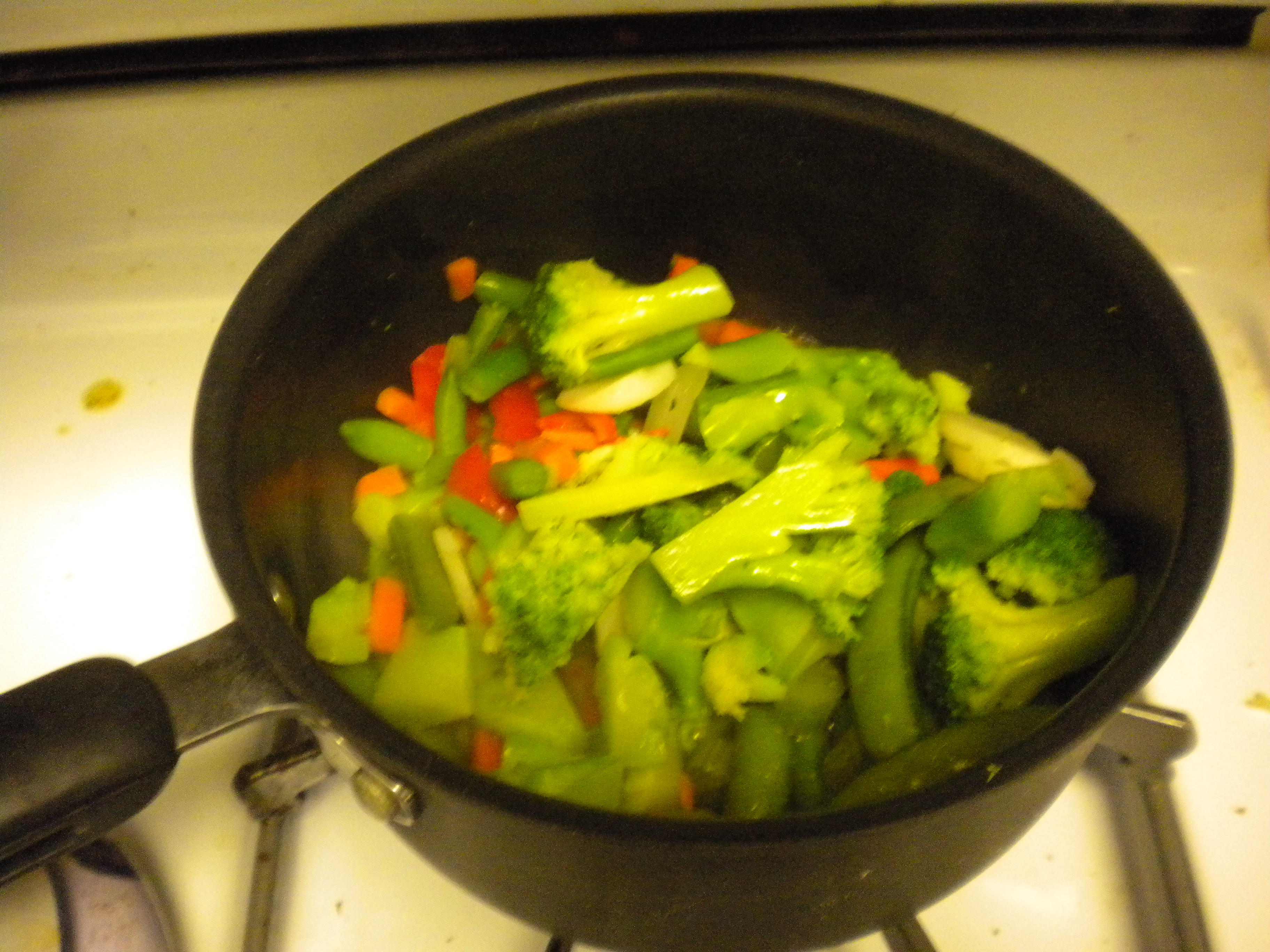 2. Steam the frozen vegetables in a pot with a bit of vegetable stock.