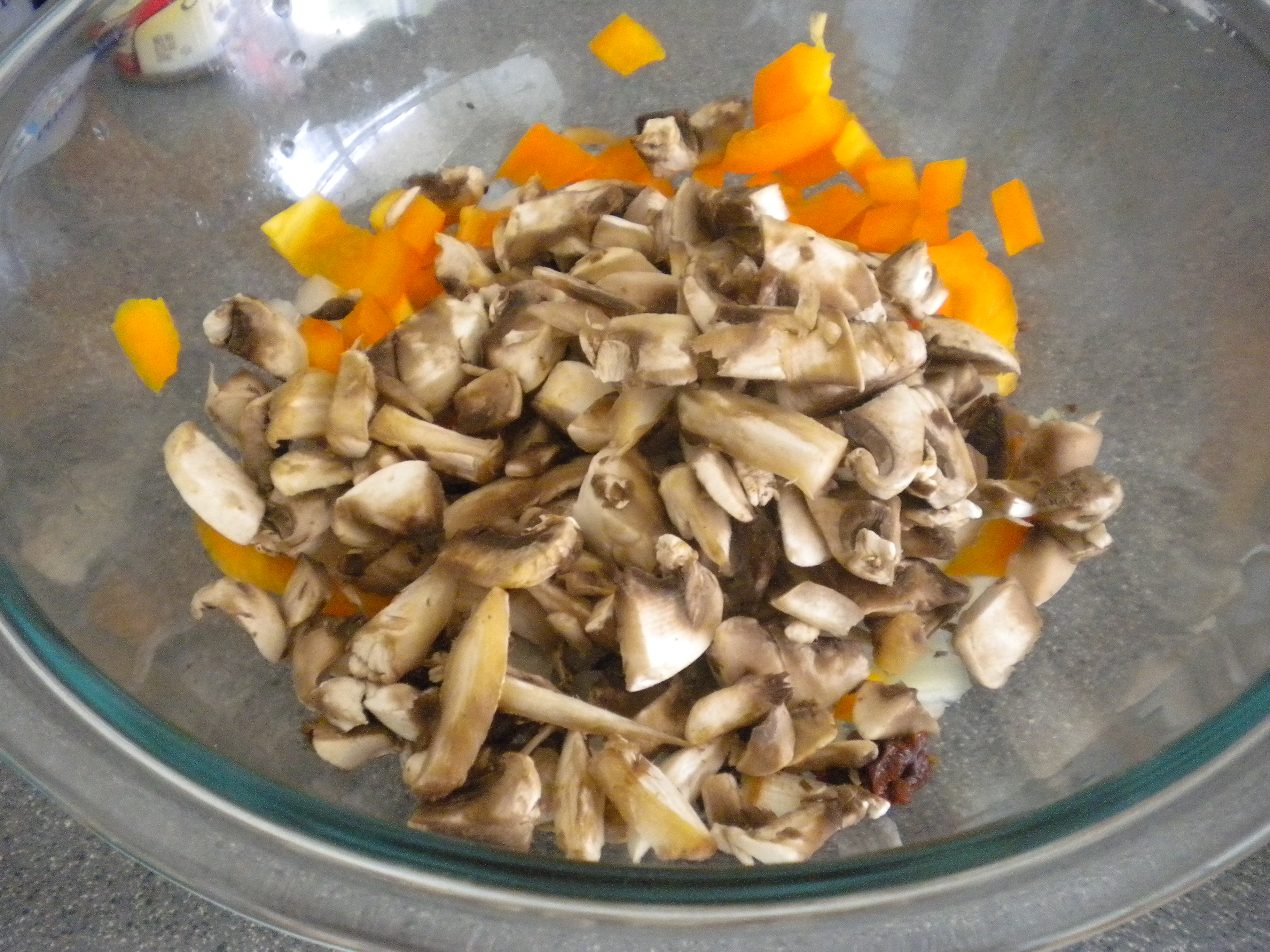 1. Chop onions, mushrooms, and orange bell pepper. Mix in big bowl.