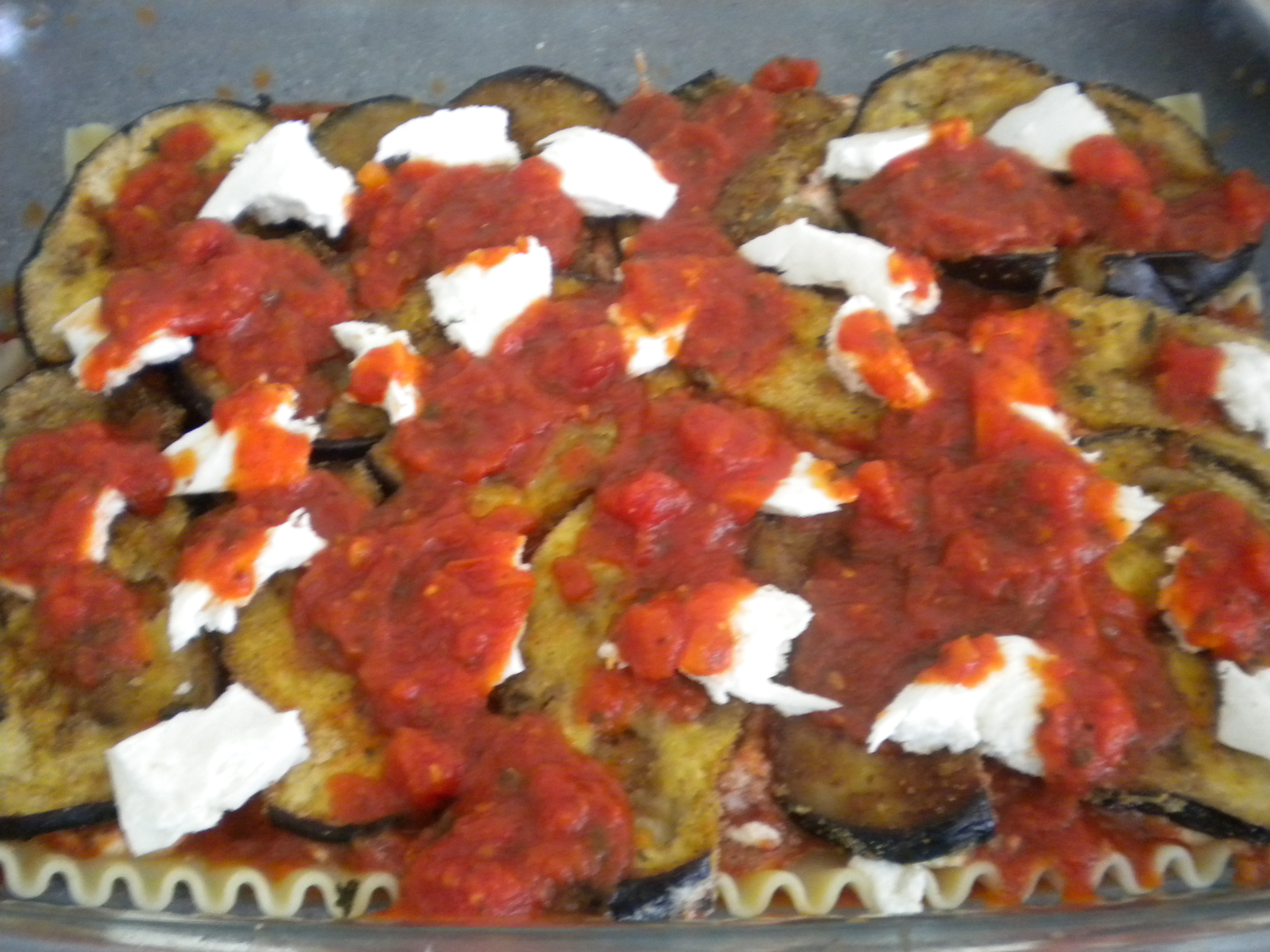 Ingredients: eggplant, lasagna noodles, low fat ricotta, fresh mozarella ball, jar of tomato sauce, and shredded mozarella