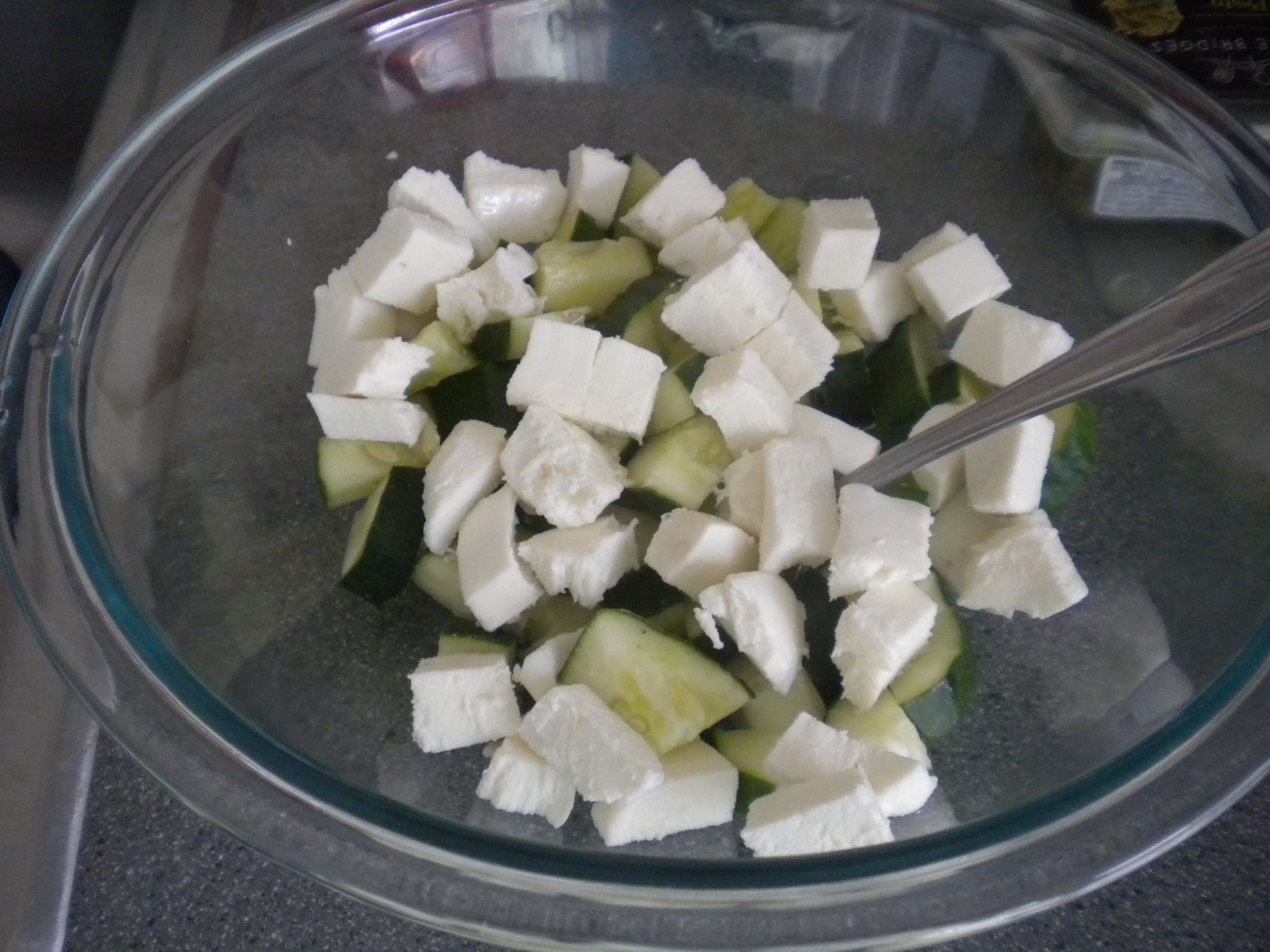 - While that was chilling, I cut the mozarella balls into small chunks and the cucumber into quarters.