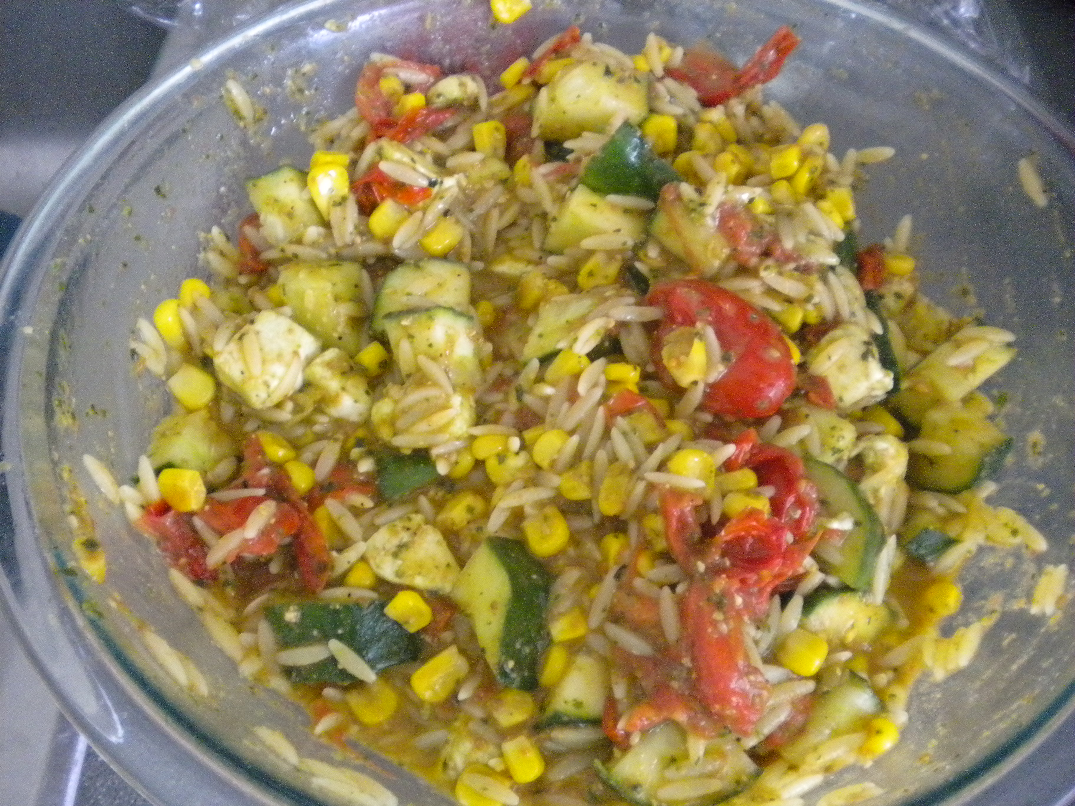 Ingredients: orzo, chicken stock, 3 large beef tomatoes, 1 cup of grape tomatoes, chucks of fresh mozarella, pre-made pesto, frozen corn, 1/2 onion, and cucumber quarters