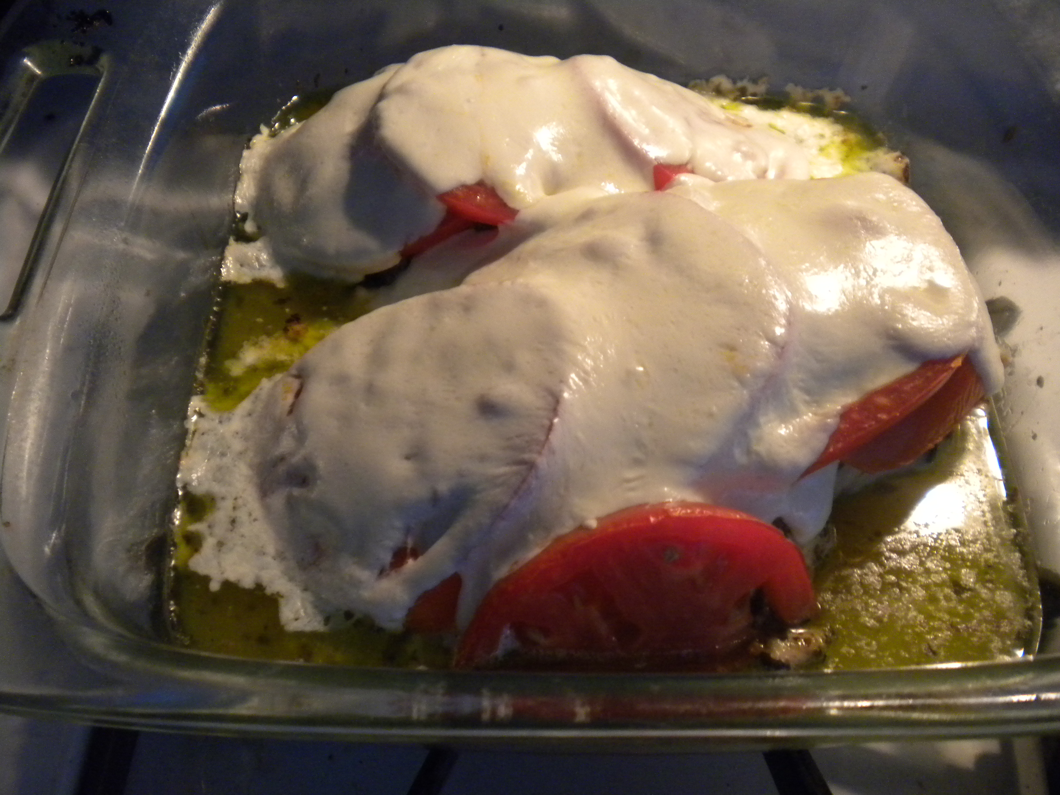 - I placed the tomatoes on top of the chicken and topped that with the cheese and put back in the oven for another 30 minutes.