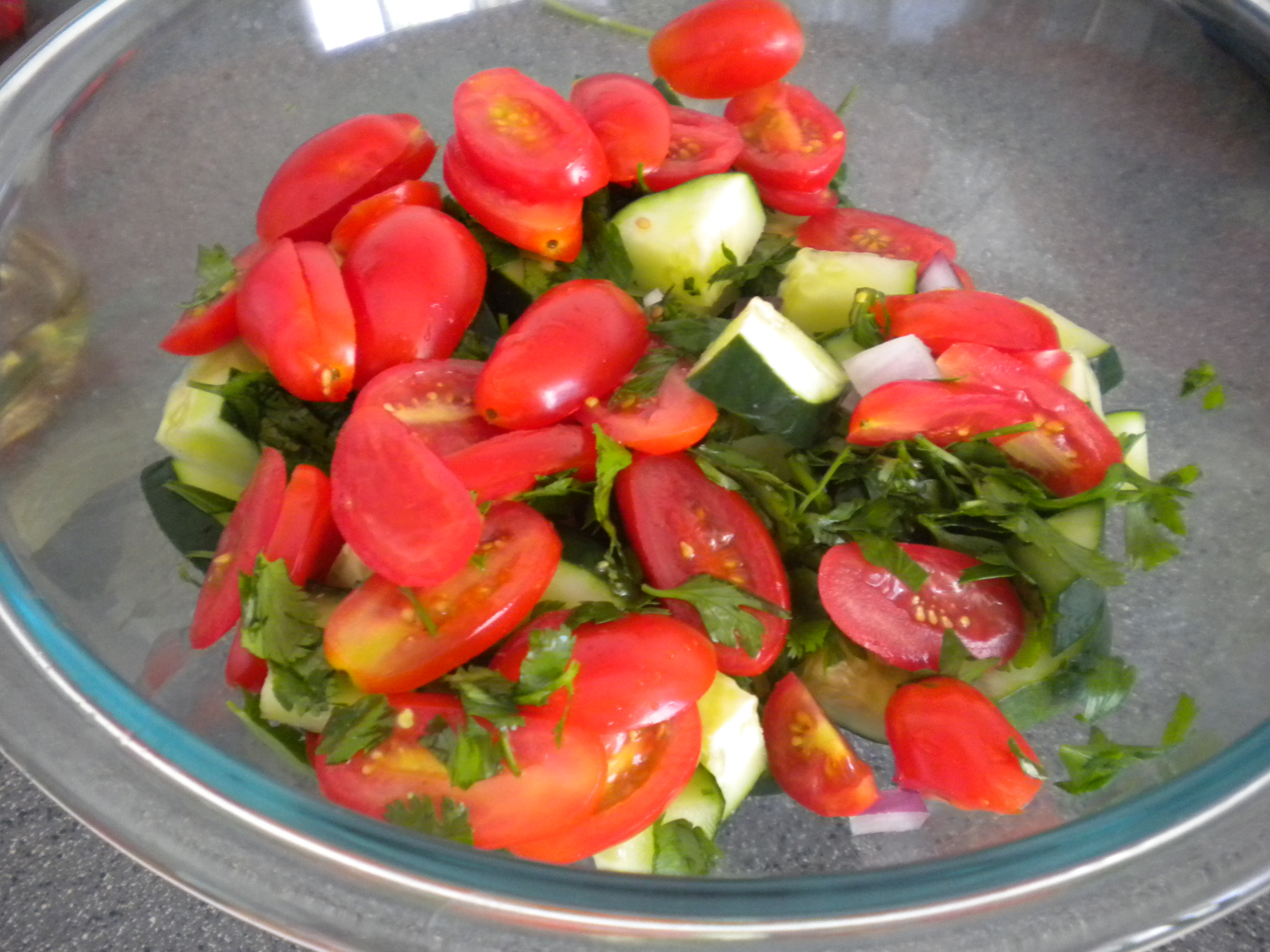 - Meanwhile, I chopped a red onion (1/2 onion), cut the cucumber into quarters, cut the tomatoes (1 cup), and chopped the mozzarella cheese (1/2 cup). Then I washed a mix of parsley and cilantro and chopped that and put it in the dish. The amount is determined by the person making this dish. Some like a lot of herbs, some dont.