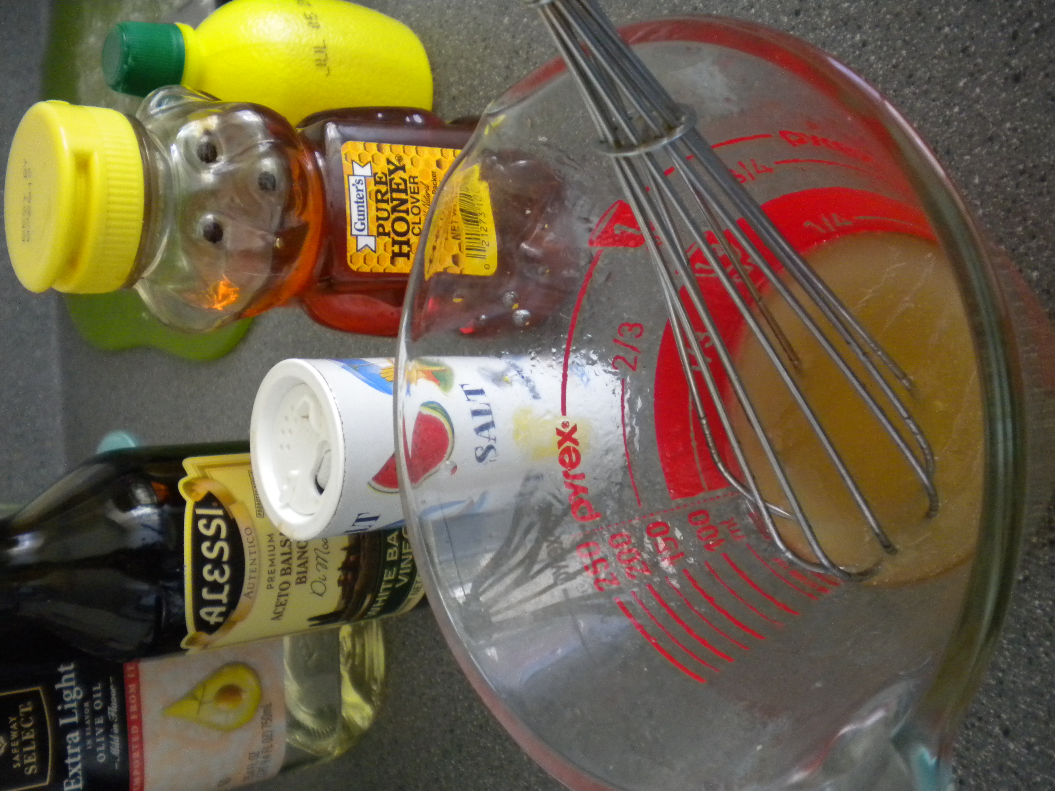 - While it was chilling for a few hours I went on to making the dressing. Now this is up to the taster. I usually like something with a bite but also sweetness. I mixed: olive oil, salt, balsamic vinegar, honey, and lemon juice.