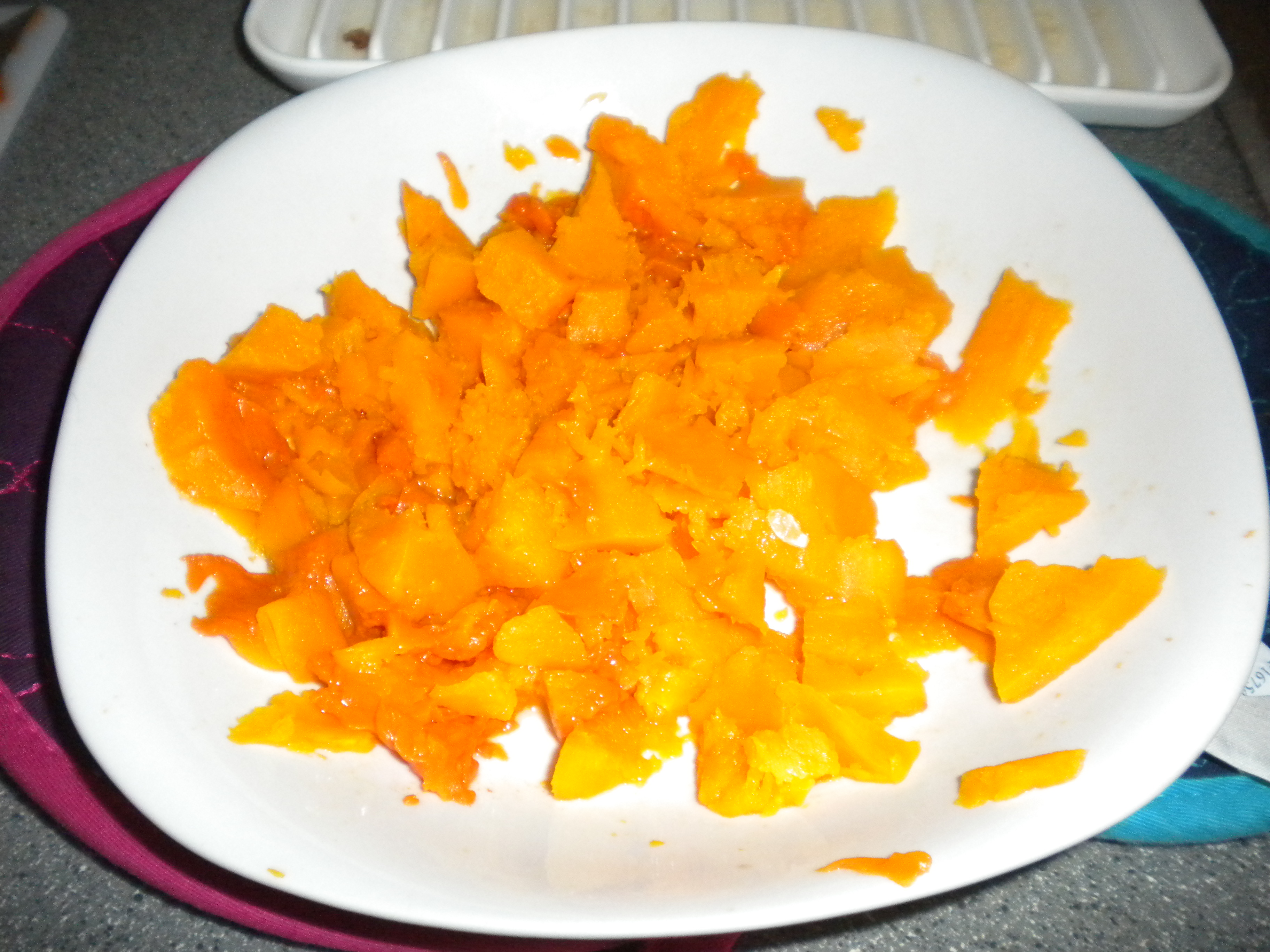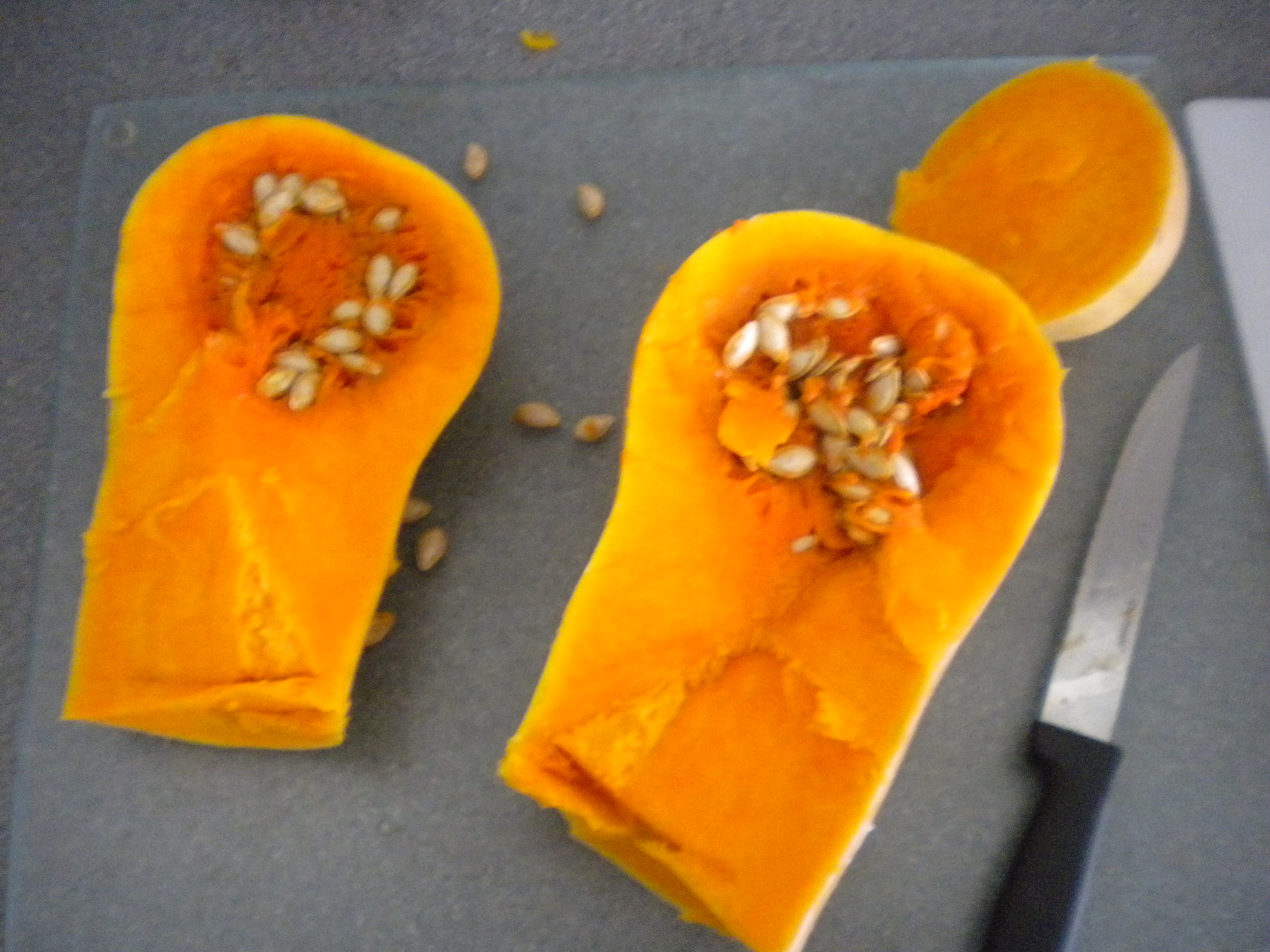First off, lets establish how hard it is to cut a butternut squash into pieces. It’s hard!!! The skin of a squash is thicker than pumpkin and the inside is not much easier to chop up. I tried to follow some directions from online, but failed, epically. Supposedly, you’re to cut the bottom and top off. Remove the seeds, then peel the skin. Then chop the inside meat up. Tada! Yah, that’s a challenge, and that’s an understatement. I tried to just cut as much as I could from the inside. But, I would recommend buy any butternut squash already cut up or frozen. Fresh is too hard, but pretty to look at (for a cornucopia).