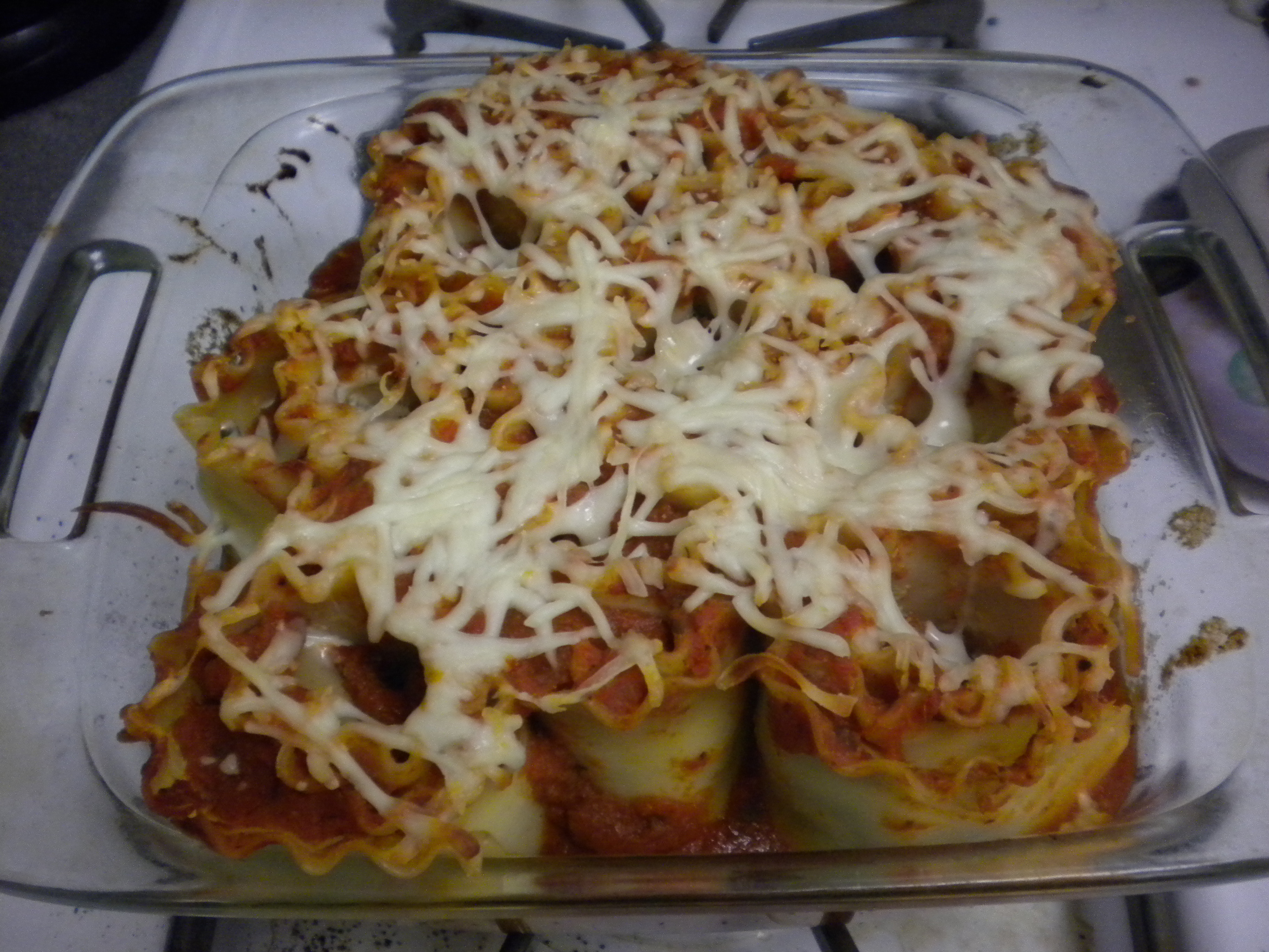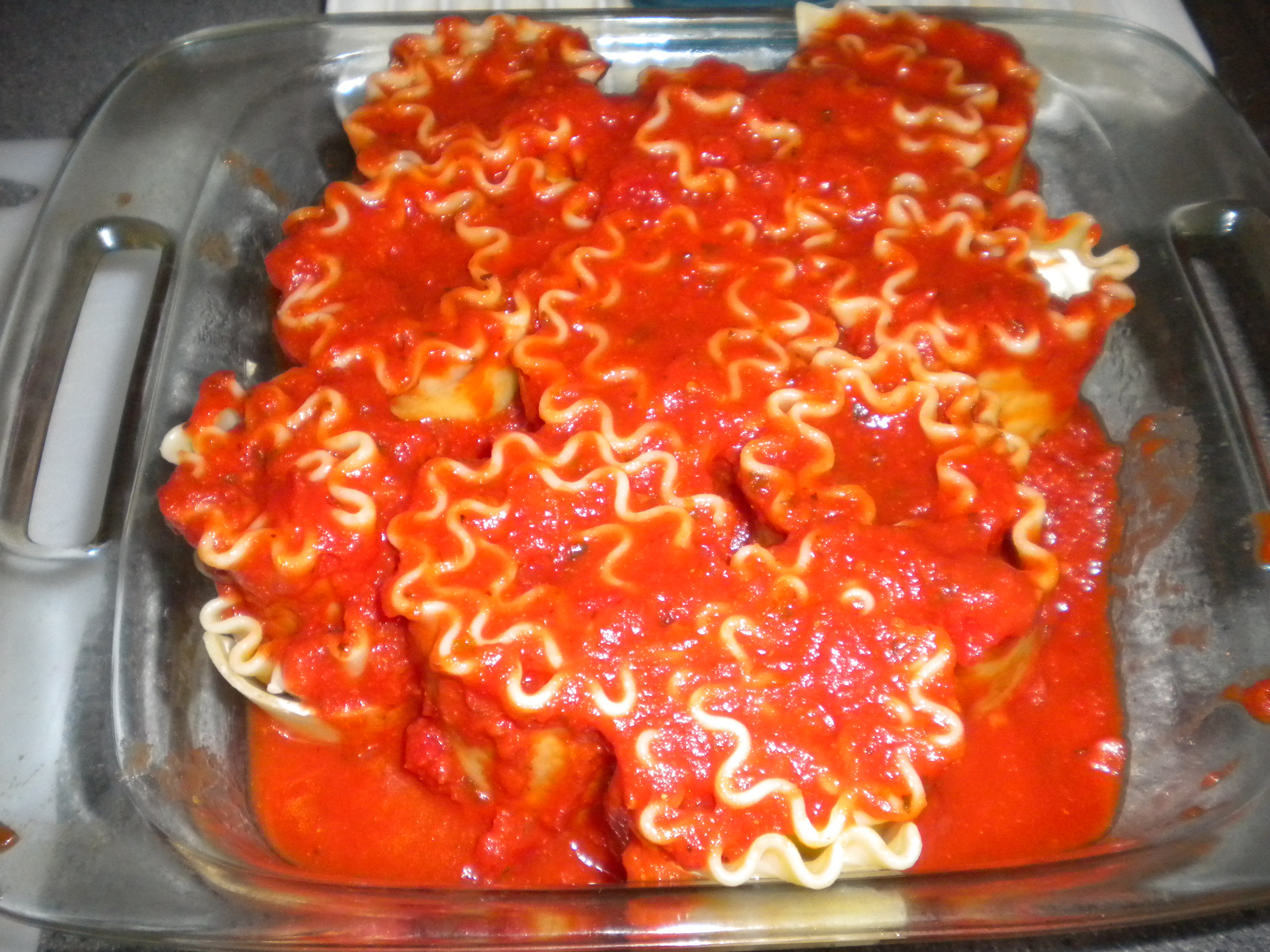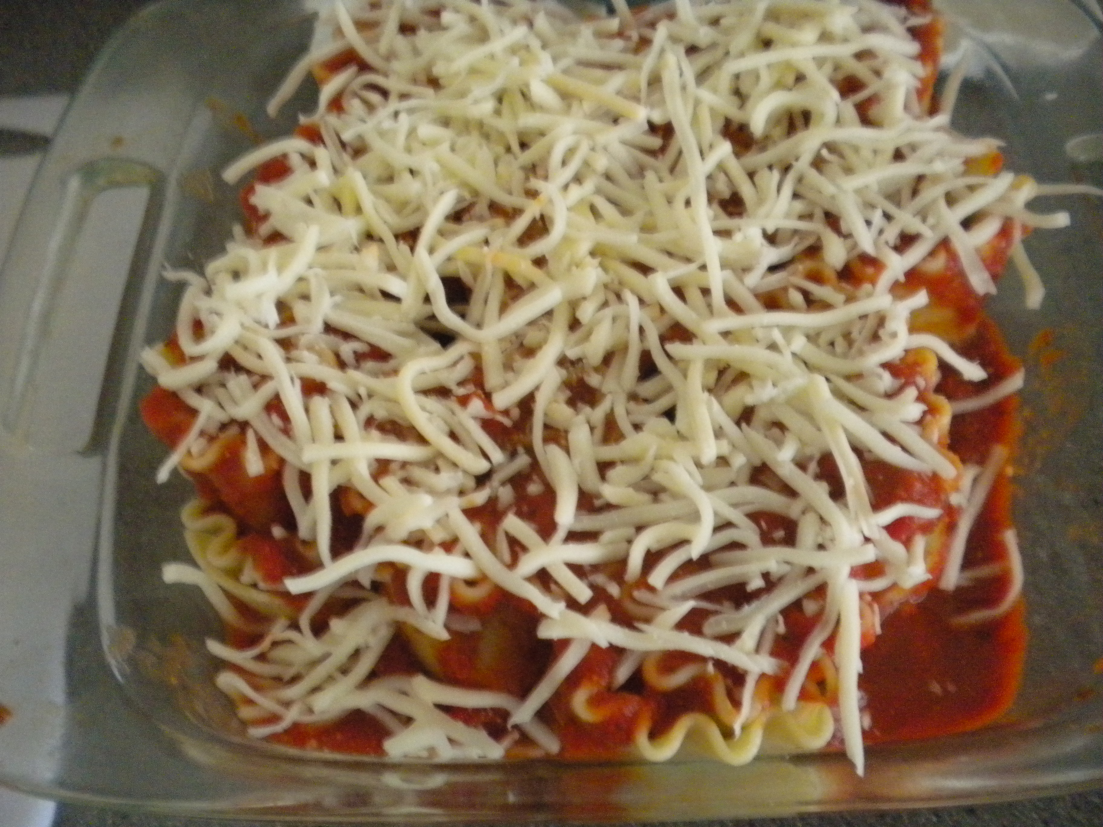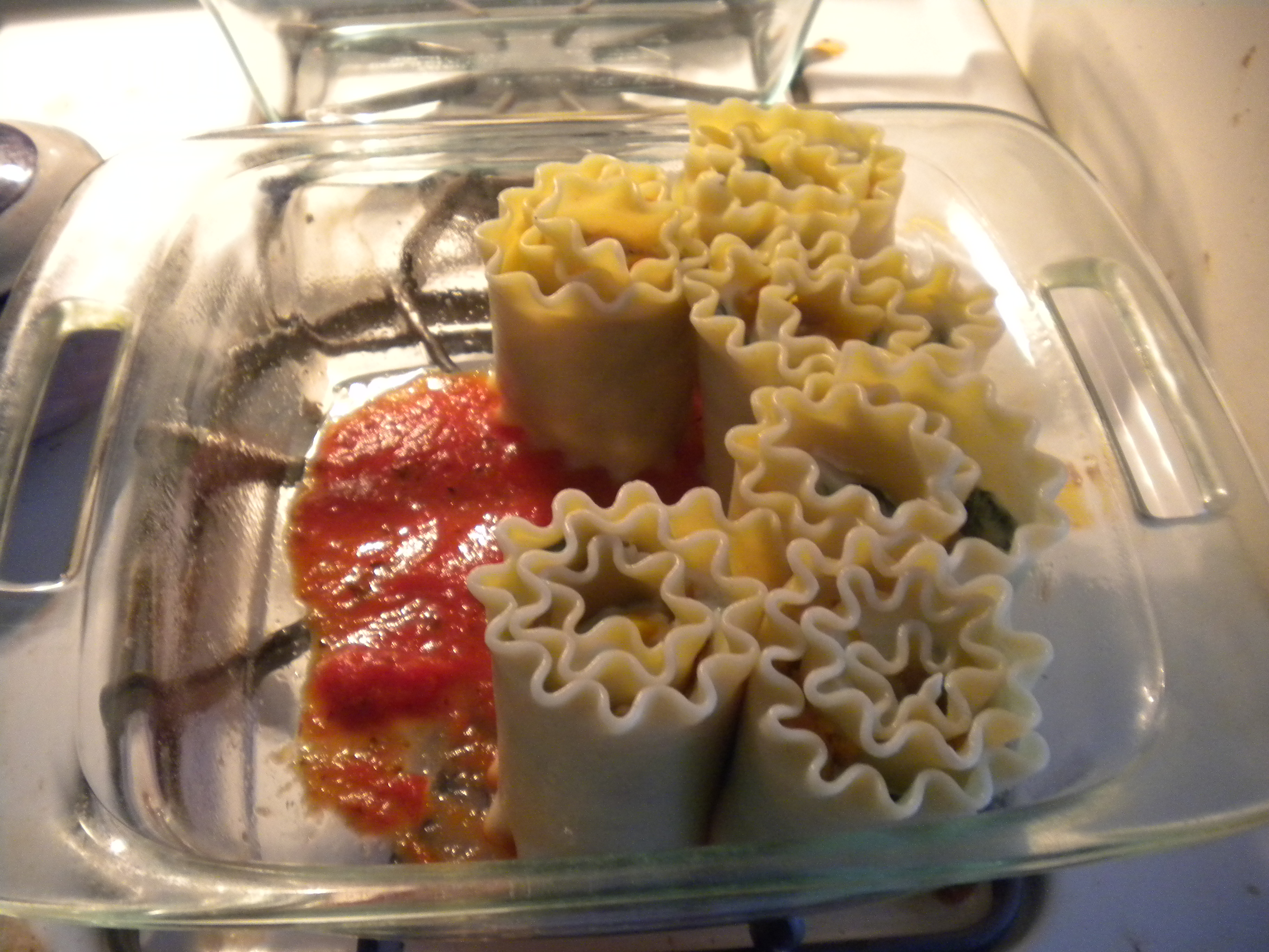 Ingredients: lasagna rolls, low fat ricotta cheese, spinach, mozzarella cheese, jar of pasta sauce, microwaved butternut squash, egg, and Italian cheese (mix of provolone and mozzarella).